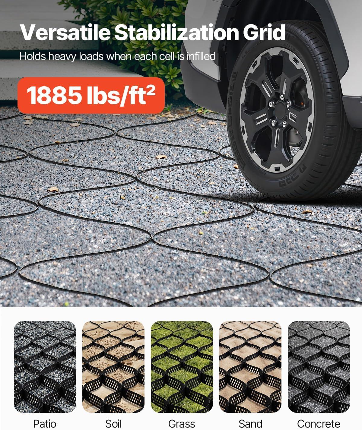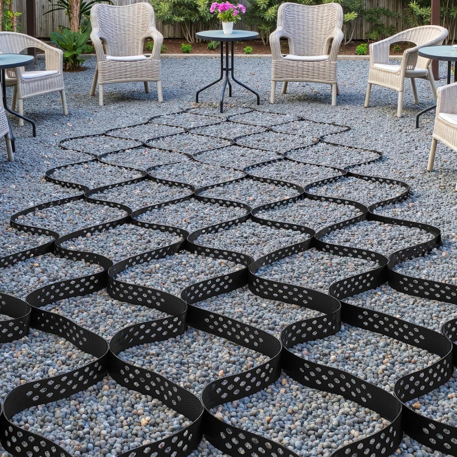 Easy Installation & Application: Installing the geo ground grid system on patios, parking lots, landscaping, driveways, pavers, shed systems, etc., is quick and easy. Simply roll out the material, secure it to the ground, connect the components, and fill the cells with your desired material