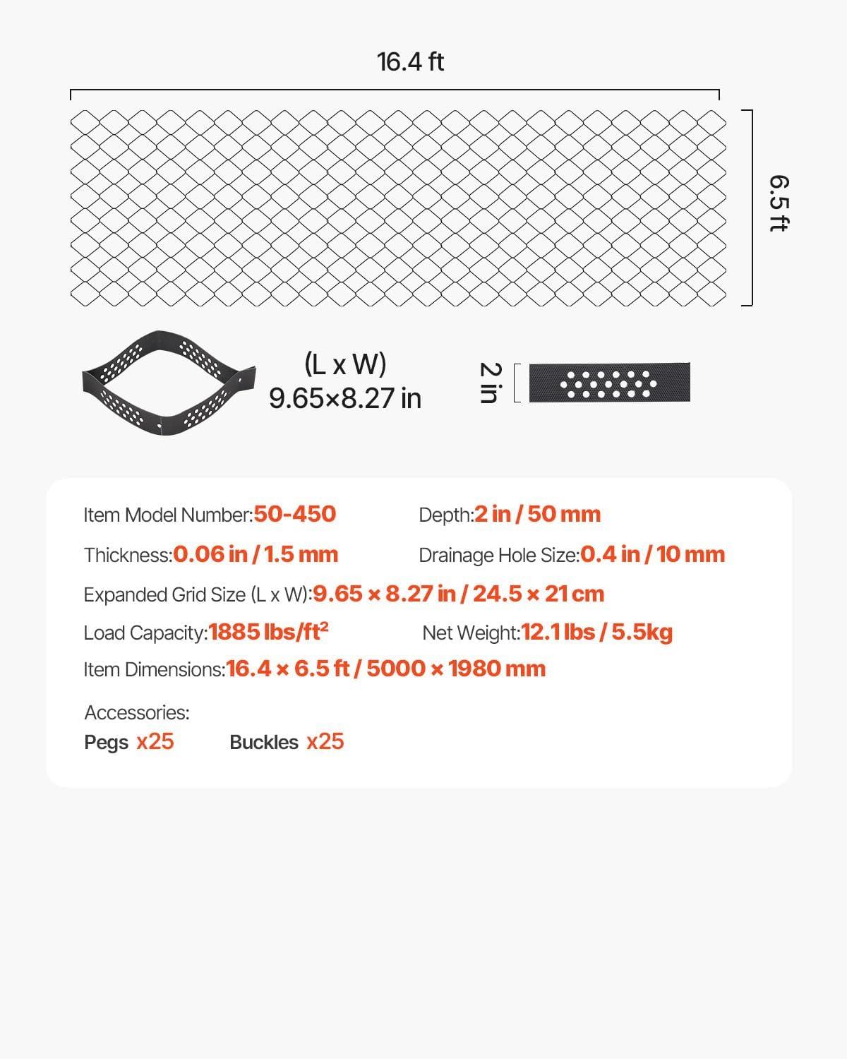2-Inch Gravel Grid: Size: Each unit measures 16.4 ft long x 6.5 ft wide, covering 106.56 sq ft. The smaller units of 9.65in x 8.27in stabilize gravel or soil within each grid cell. The 2 inch deep ground grid is ideal for creating a firm surface on slopes or flat areas (especially on soft or unstable terrain). It also helps avoid further erosion and allows immediate foot or vehicle traffic