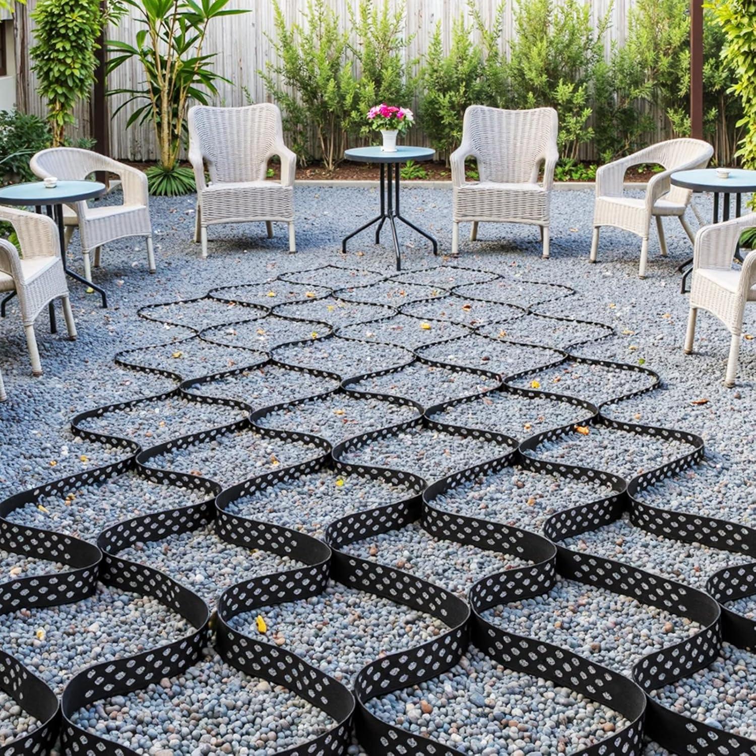 Easy Installation & Application: Installing the geo ground grid system on patios, parking lots, landscaping, driveways, pavers, shed systems, etc., is quick and easy. Simply roll out the material, secure it to the ground, connect the components, and fill the cells with your desired material
