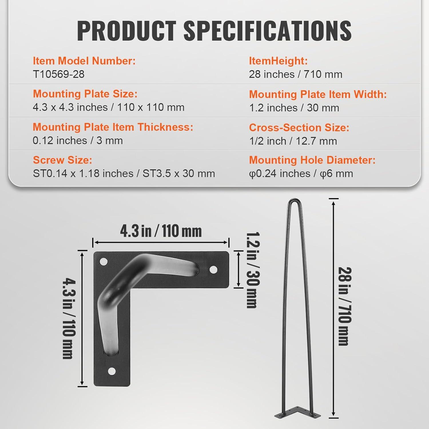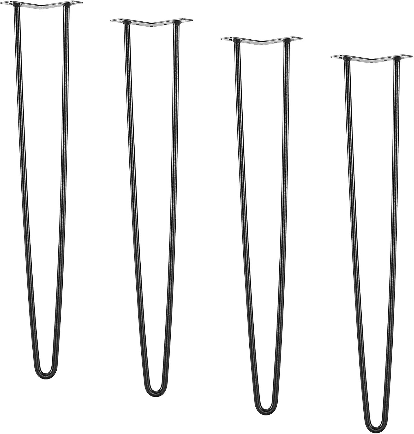 VEVOR Hairpin Table Legs 28″, Set of 4 Desk Legs 900lbs Load Capacity, Hairpin Desk Legs 3 Rods for Desk Chairs Bench Dining End Table, Solid Carbon Steel Heavy Duty Furniture Legs Black(Hairpin-2 rods)