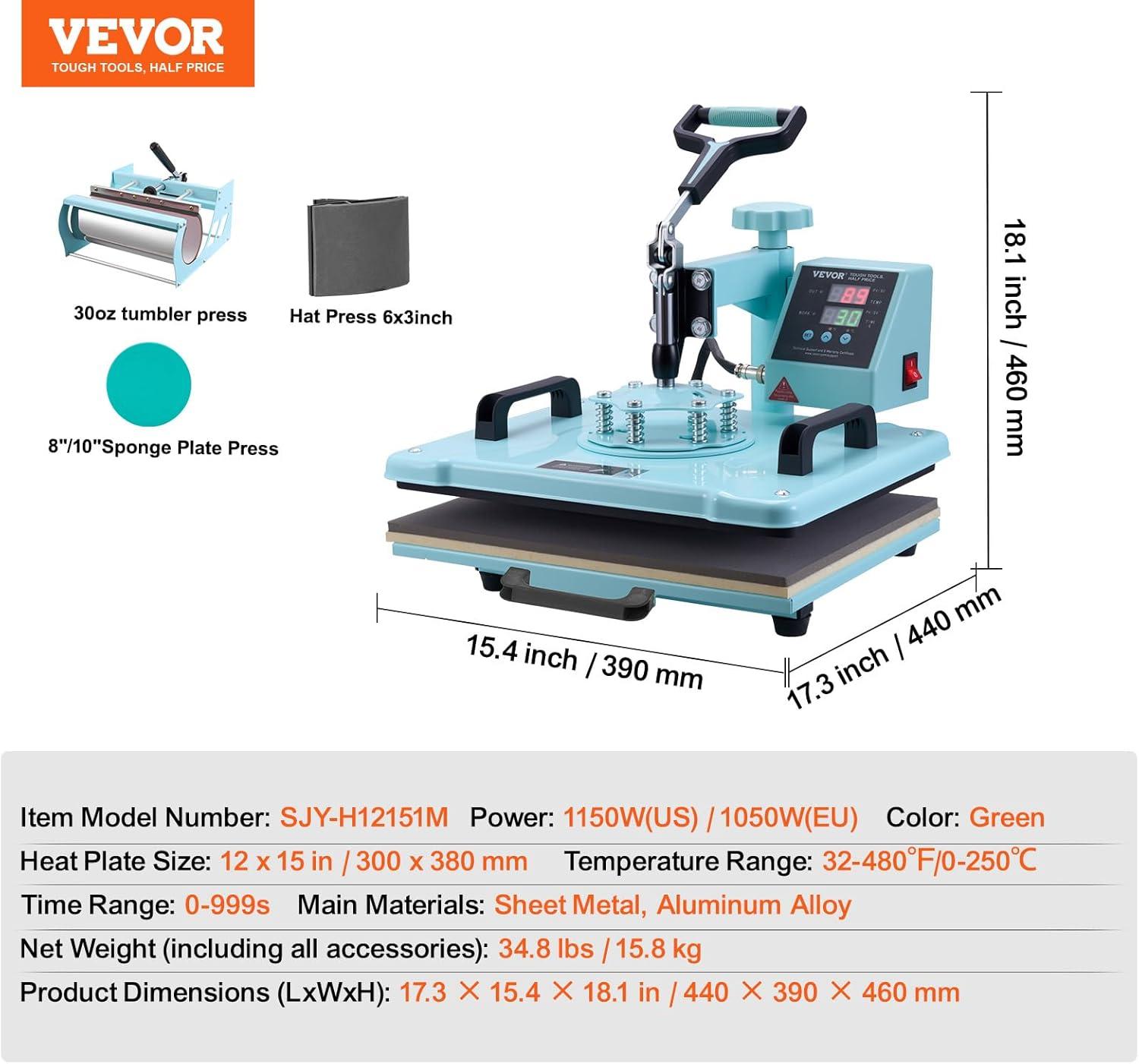 Don’t miss out on our limited-time offer: buy VEVOR Heat Press Machine, 12 x 15 inch, 5 in 1 Heat Transfer Machine with 30 oz Tumbler Press, 360° Swing Away T-Shirt Pressing, Digital Precise Control, for T-Shirts/Mugs/Hats/Plates, Green(5in1-12×15-30OZ-Green), get a free {accessory}!