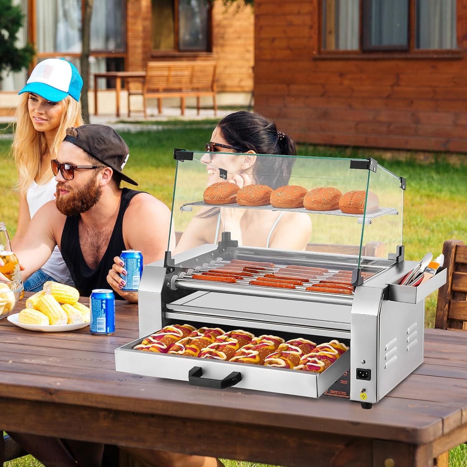 Built to Impress & Last: Built with a durable, sleek stainless steel frame, this commercial hot dog roller provides not only a modern look but also long-lasting performance. The glass hood is offered to block dirt and keep food warm, thus shortening cooking time. The removable drip tray keeps your kitchen clean and washing to a minimum