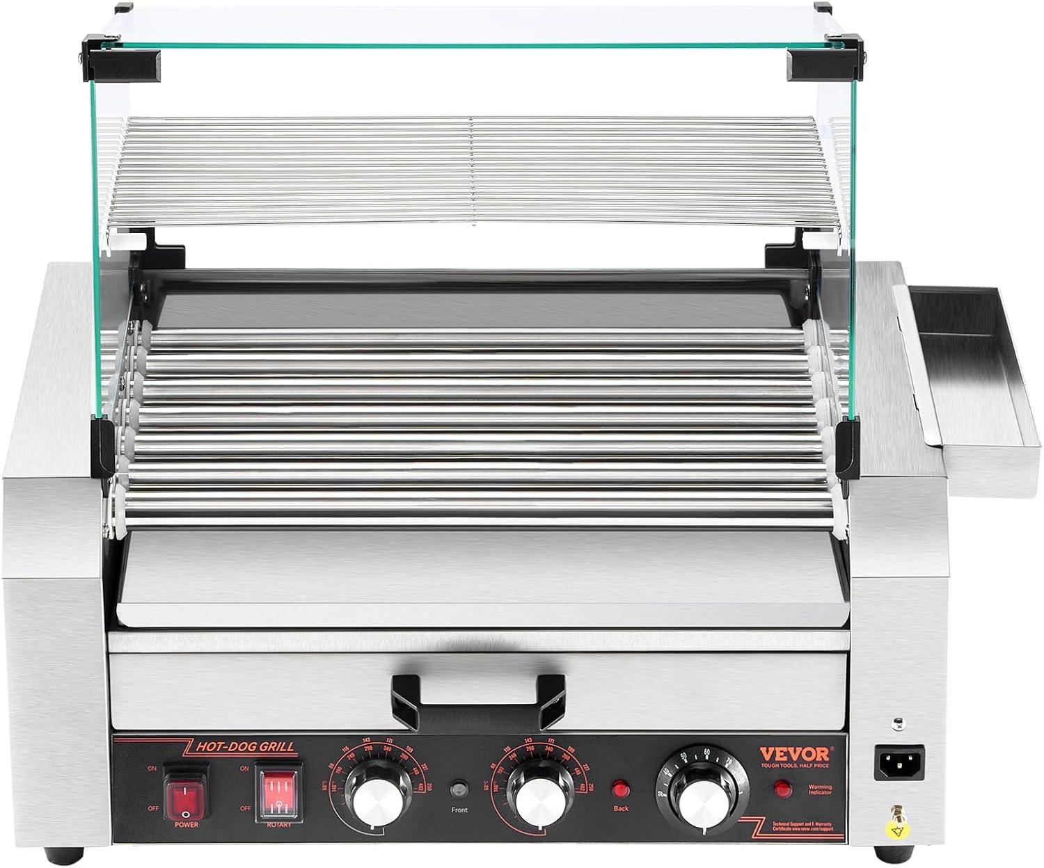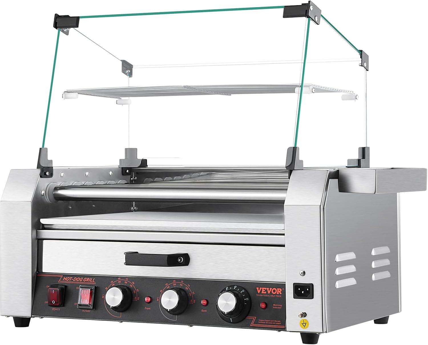 VEVOR Hot Dog Roller, 18 Hot Dog 7 Rollers, Stainless Steel Sausage Grill Cooker, 1200W Hot Dog Machine with Bun Warmer, Cover, 3 Temp Control, Side Storage Box, Oil Drip Tray, for Home & Commercial(11 Rollers+Bun Warmer)