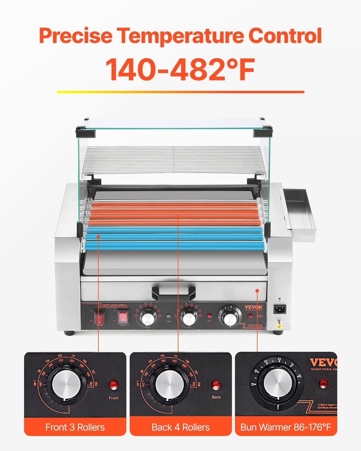 Precise Temperature Control: This roller grill can adjust the cooking temperature up to 482°F separately for front and back rollers. The left knob controls the front 3 rollers, and the right knob controls the back 4 rollers. Additionally, another knob can warm the bun