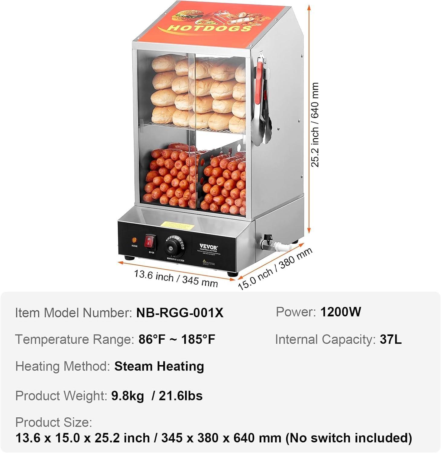 VEVOR Hot Dog Steamer, 36L/32.69Qt, Classic Hut Steamer for 96 Hot Dogs & 30 Buns, Electric Bun Warmer Cooker with Drop Down Door Acrylic Window Partition Plate Food Clip PTFE Tape, Stainless Steel(RGG-002)