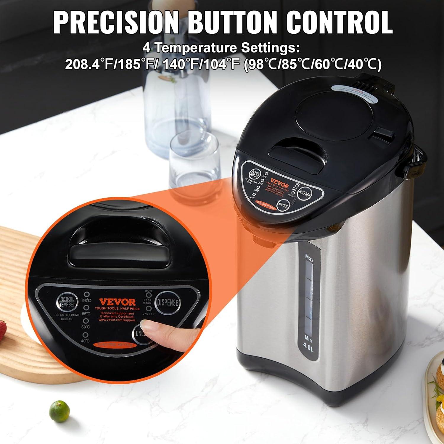 Precision Temperature Control: Experience 4 distinct temperature settings: 208.4°F, 185°F, 140°F, and 104°F (98°/85°/60°/40°). You can preset your desired temperature, and the hot water dispenser countertop efficiently maintains your choice. Ensure your beverages like milk, honey water, lemon-infused delights, or soothing tea are always brewed to perfection.