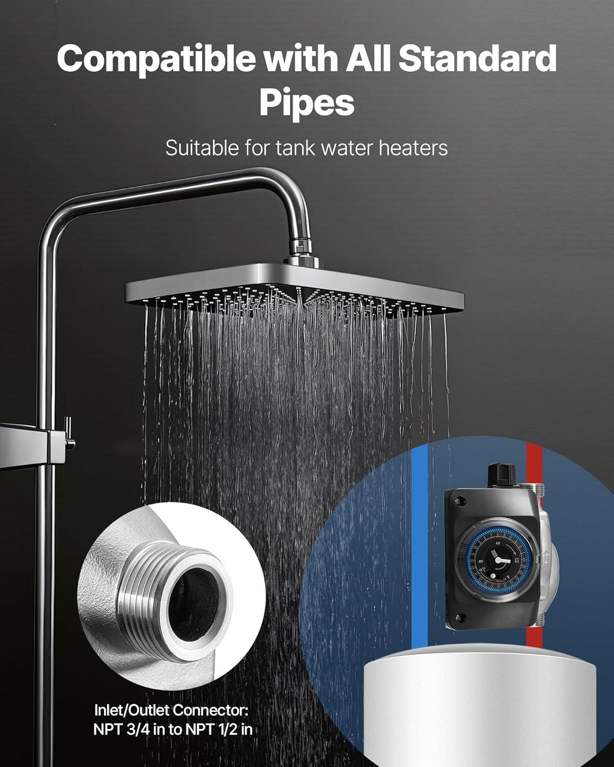 Programmable Timer: Features a built-in mechanical timer that lets you program when the hot water circulation pump runs. Customize your hot water supply to match your household’s daily schedule, ensuring comfort while saving energy