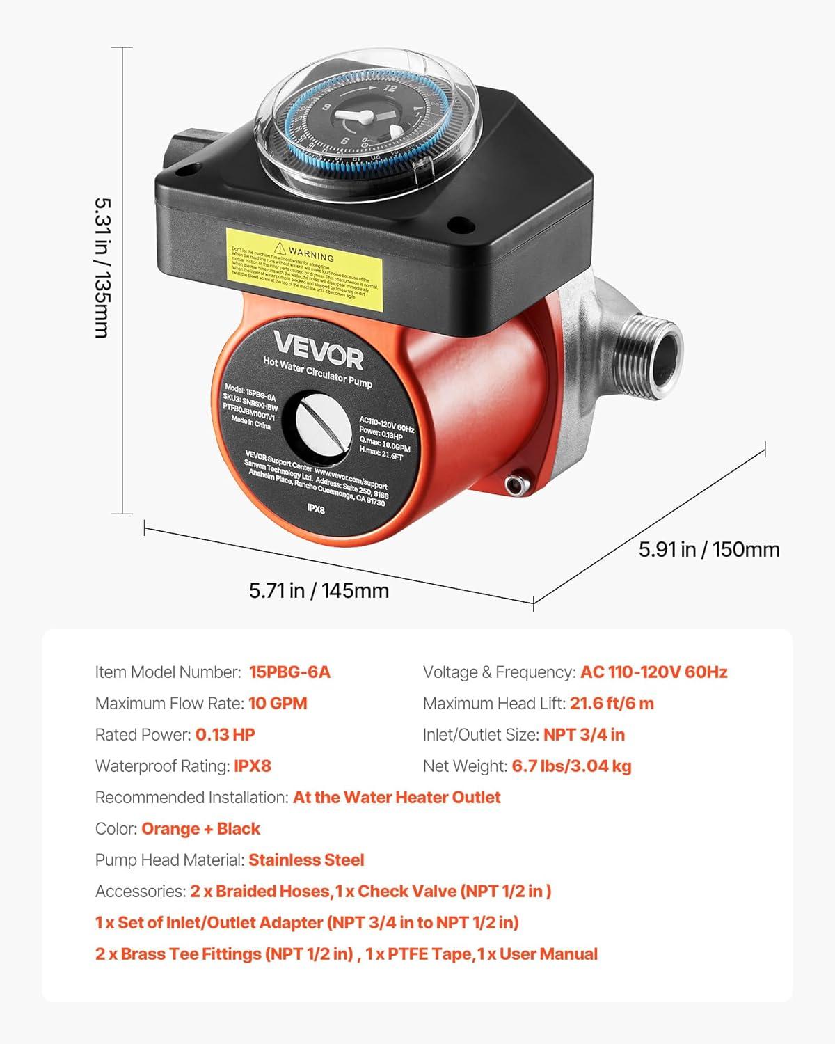 Save big on VEVOR Hot Water Recirculating Pump, with Bypass Valve, Instant Recirculation Pump Kit with Timer, Adapter, Circulation Circulator System, Stainless Steel Head, 0.13 HP 110-120V, for Tank Water Heaters(Stainless Steel with Bypass Valve and timer) during our summer blowout sale. Limited quantities available.