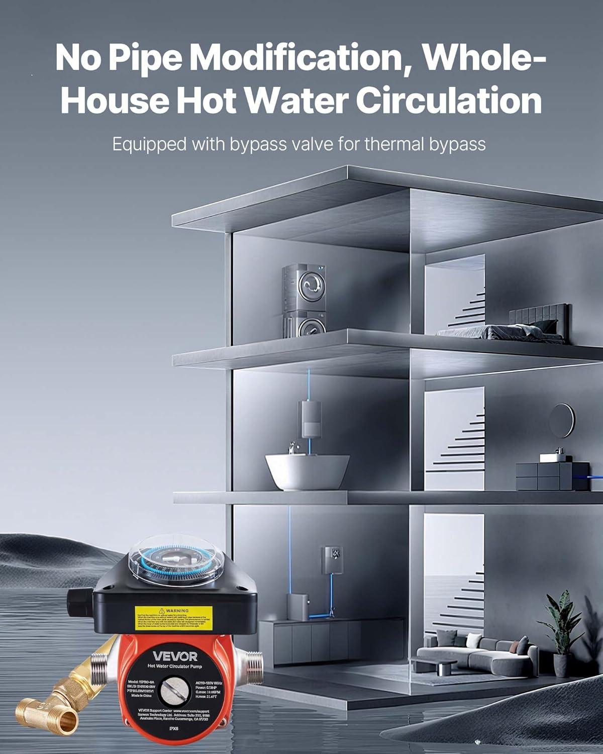 Whole-House Hot Water Circulation: The bypass valve ensures smooth circulation throughout your entire home. This hot water circulating pump is ideal for floor heating, boilers, solar water heaters, electric water heaters, kitchen faucets, and more