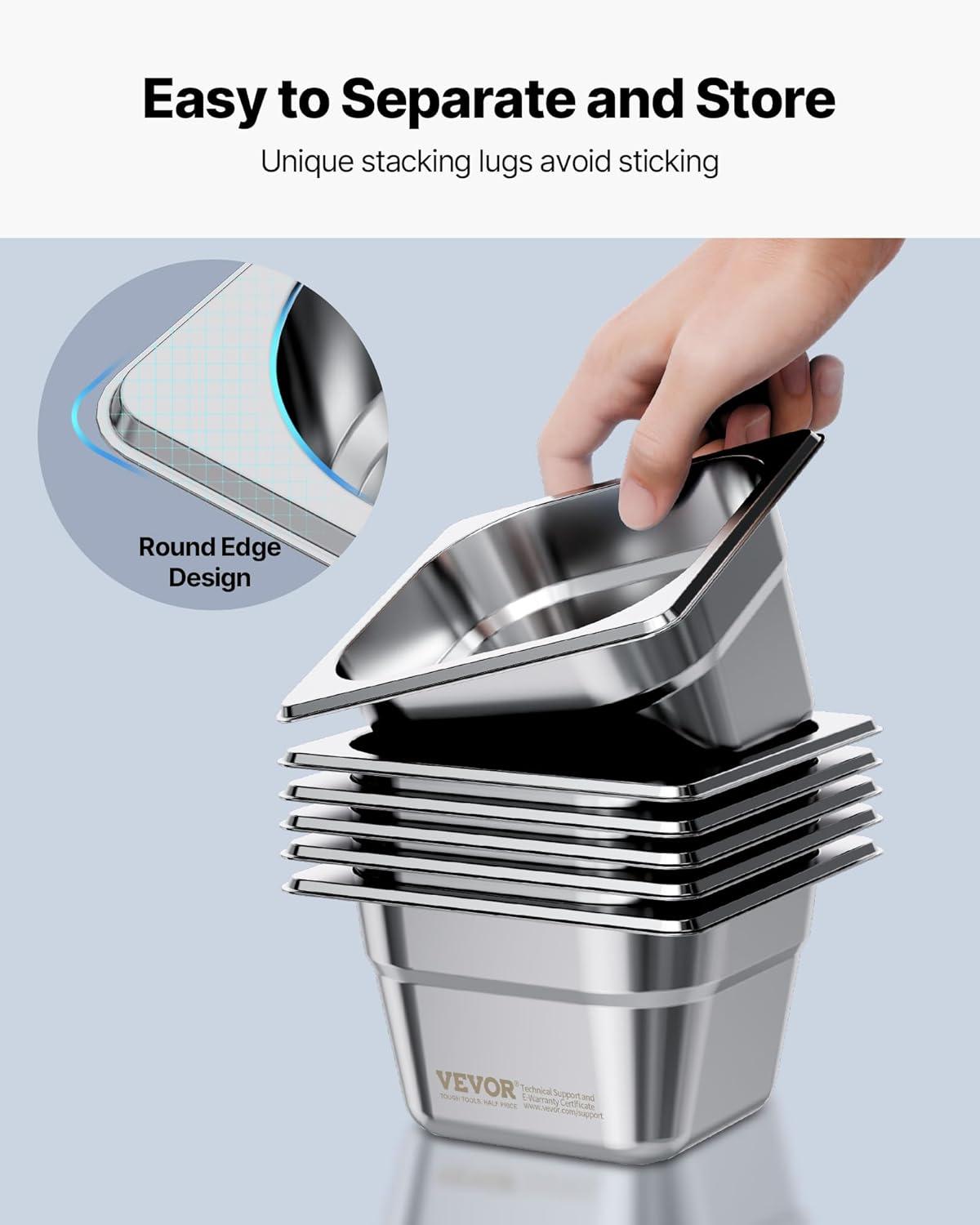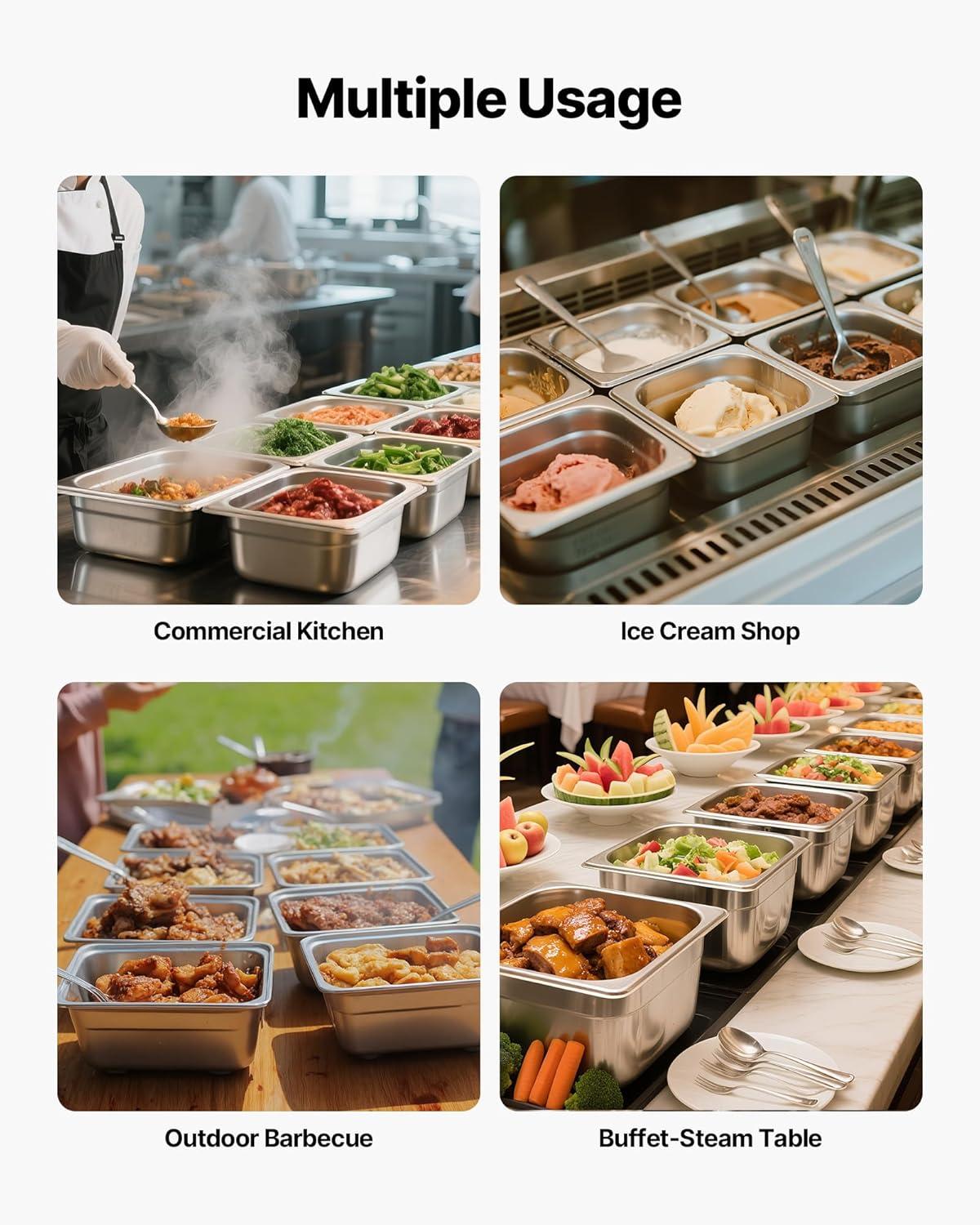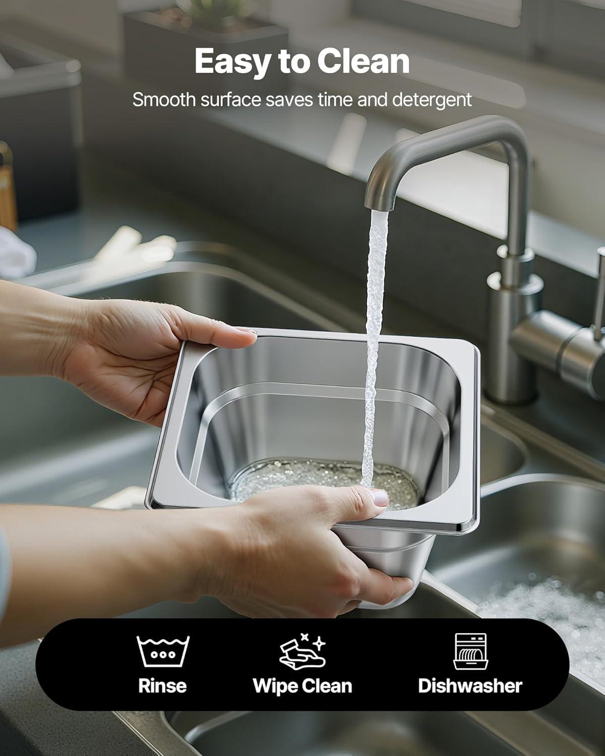 Considerate Design: Rounded corners protect you from scratches and nicks. Higher edge flatness help reduce or avoid dent and scratches. Integrated design, no welding, and gaps. Wide crimping design for secure and comfortable holding. The deep hotel pan is durable and strong, not easy to get damage.