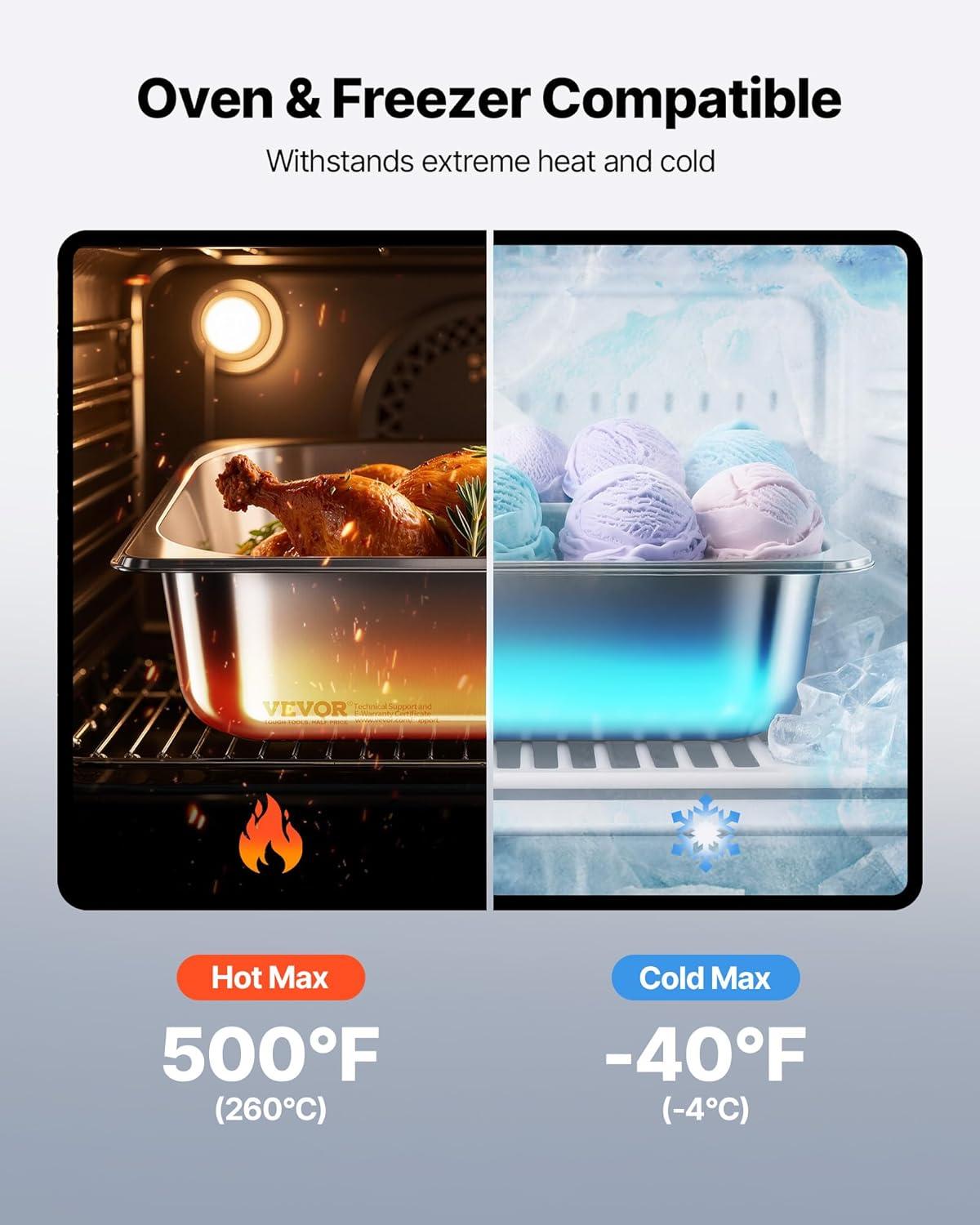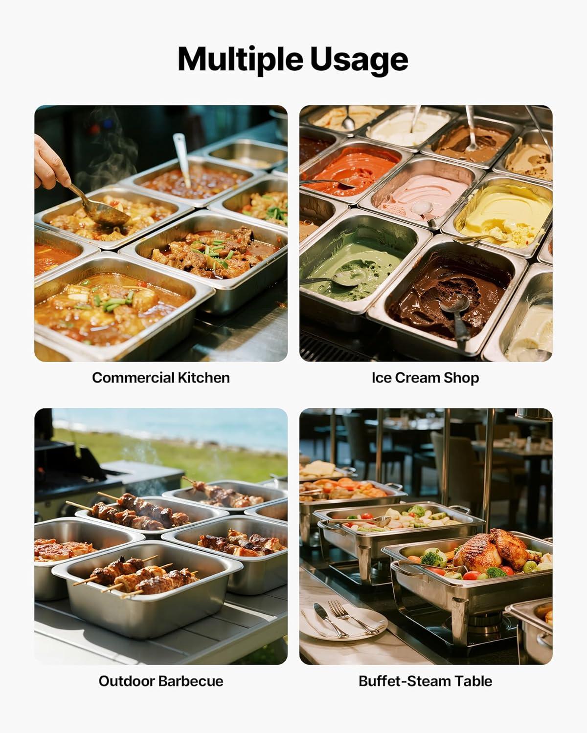 Superior Heat Conductivity & Preservation: Easily holds your favorite hot and cold foods. The full size hotel pan can heat food evenly; withstands temperatures of up to 932 Fahrenheit. The anti-jam steam table pan is a superior fit, and heating efficiency extends holding times.The design with lid can achieve better heat preservation effect and avoid dust falling into the pan.