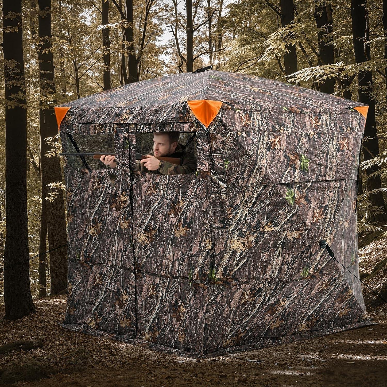 Resistant to Harsh Weather: Our upgraded all-aluminum hub use a sturdy structure. The hunting ground blind is made of 150D waterproof fabric, rain and wind-resistant. Solid fiberglass tubes are detachable. Reflective fabric can be attached