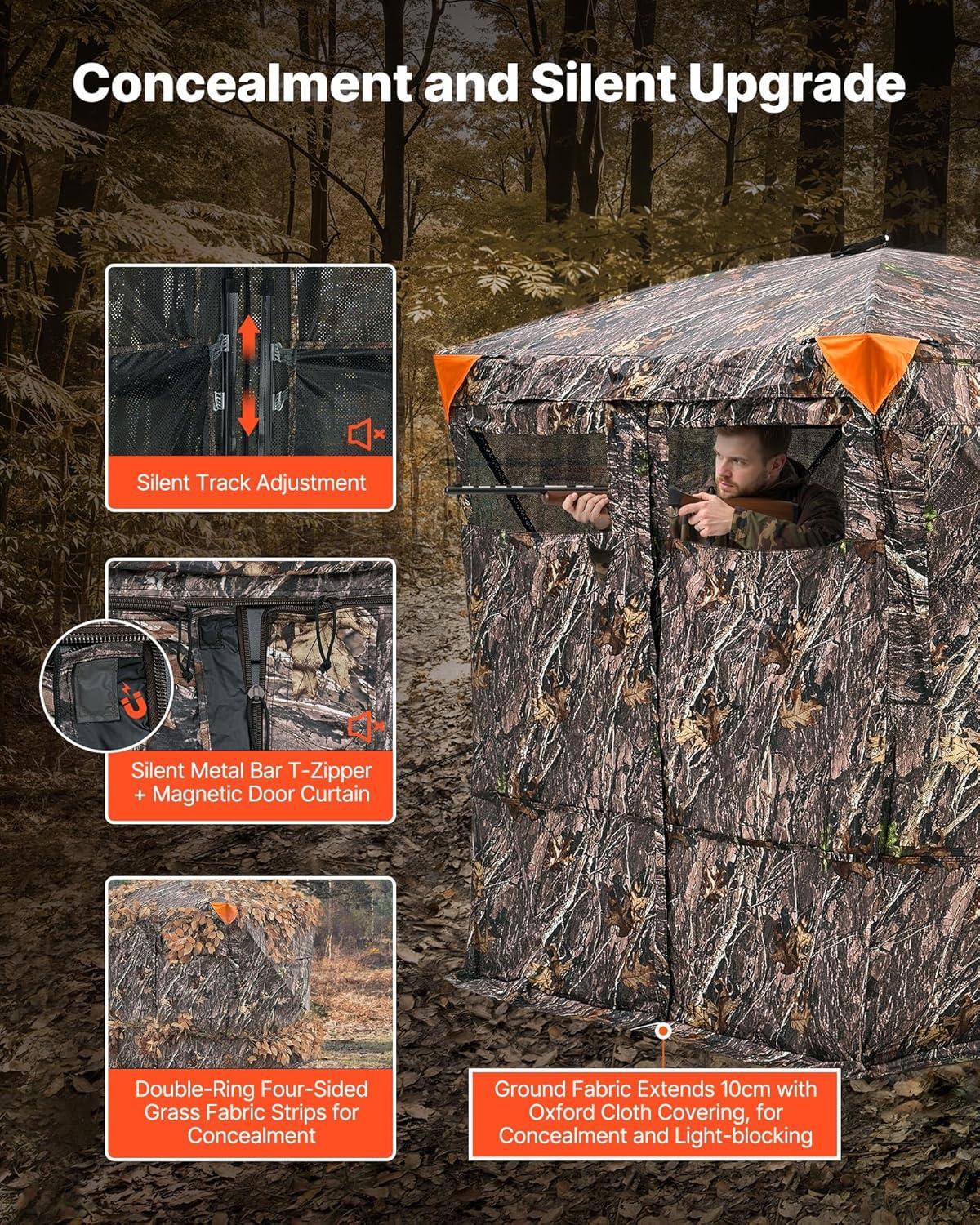 Silent Hunting Upgrade: The hunting blind uses a silent method with an internal sewn steel bar structure. The door is lockable and zippered, featuring automatic closure. The windows and silent slide rails offers a 270° wide view for easy tracking