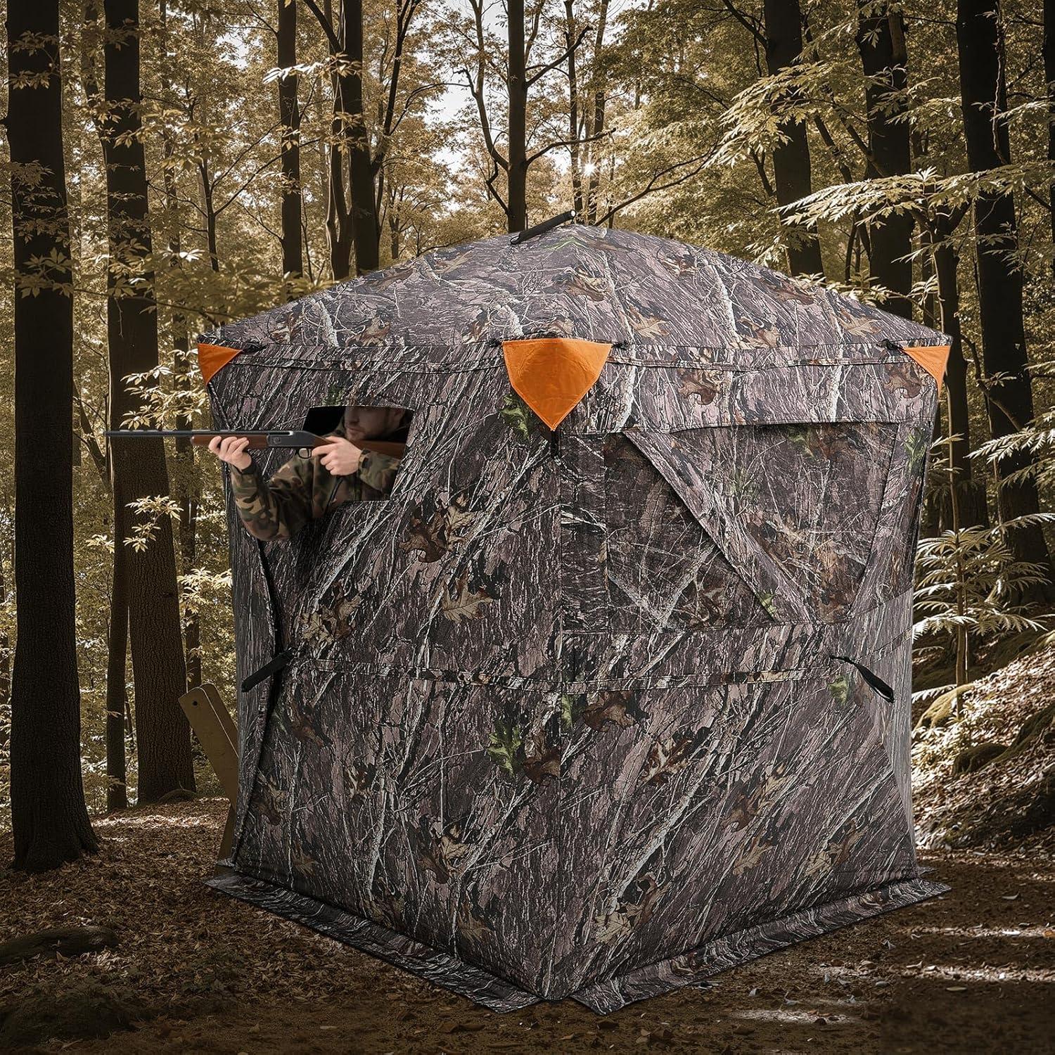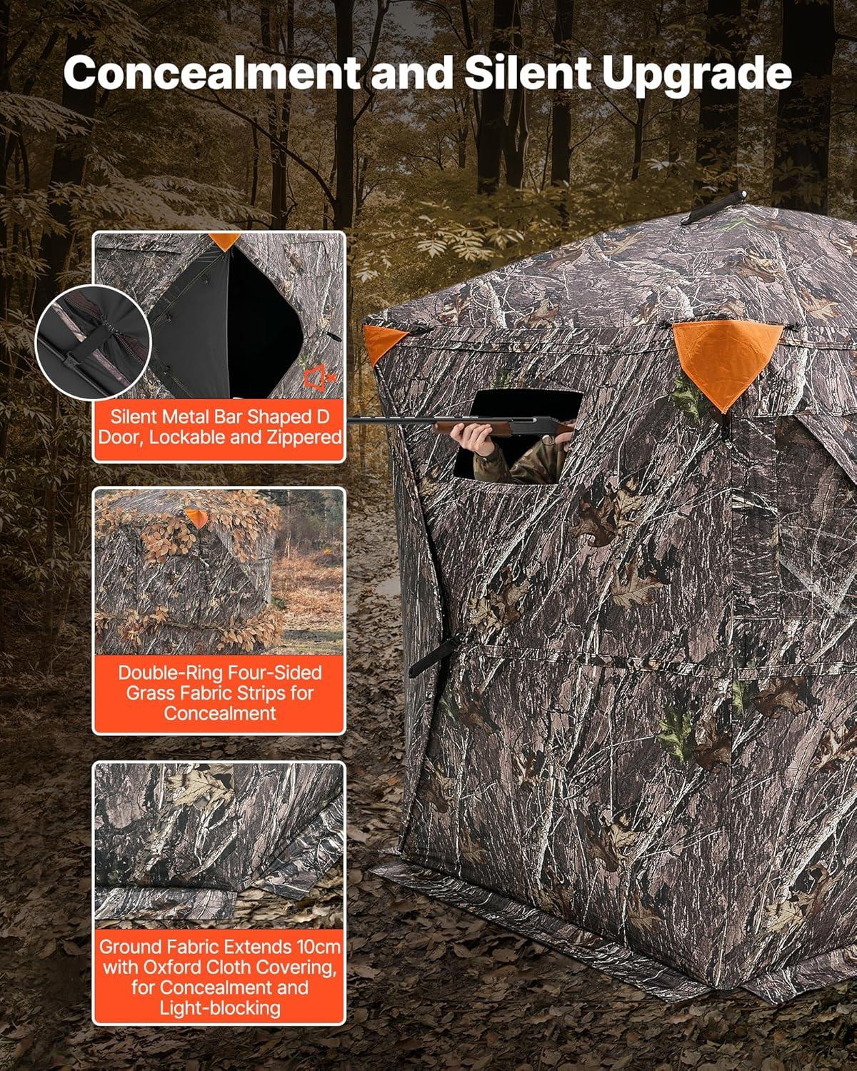 Silent Hunting Upgrade: The hunting blind uses a silent method with an internal sewn steel bar structure. The door is lockable and zippered, featuring automatic closure. The windows and silent slide rails offers a 270° wide view for easy tracking