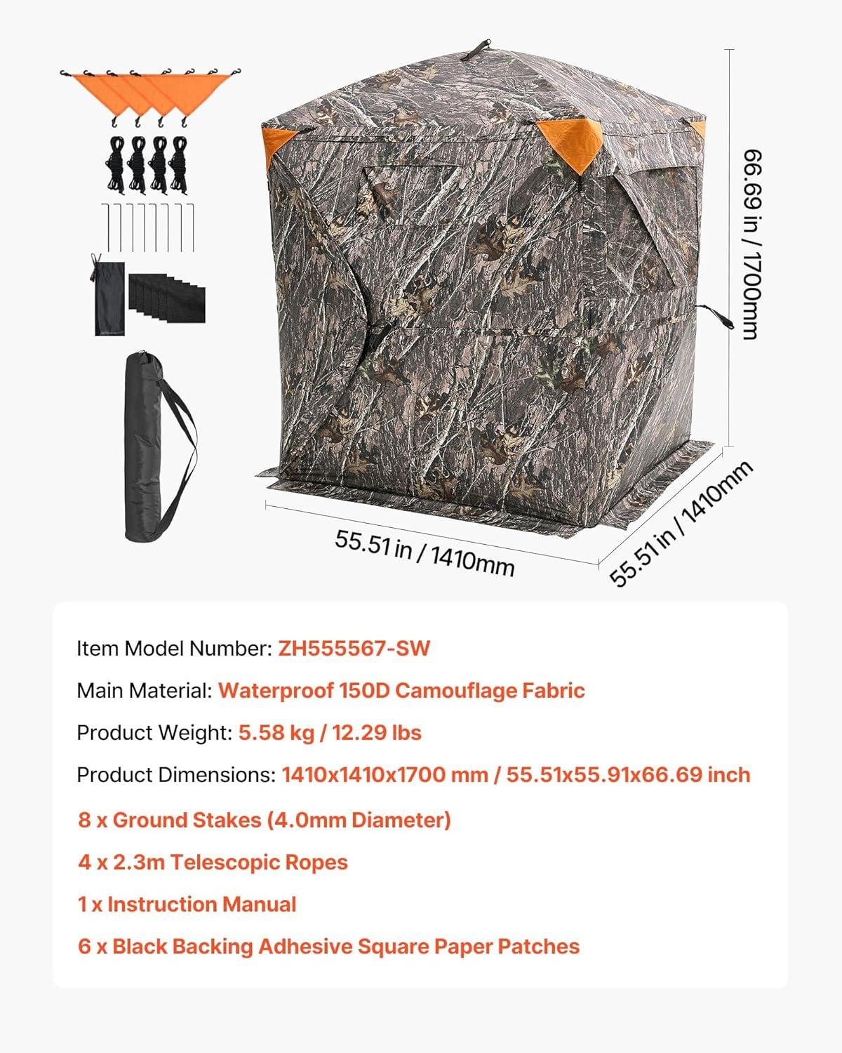 VEVOR Hunting Blind,See Through Ground Blinds with Carrying Bag, 360 Degree Portable Camouflage Tent,Durable Concealed Shelter with Silent Side Door and Window, for Turkey and Deer(Horizontal Windows-55.5 x 55.5 x 66.9″)