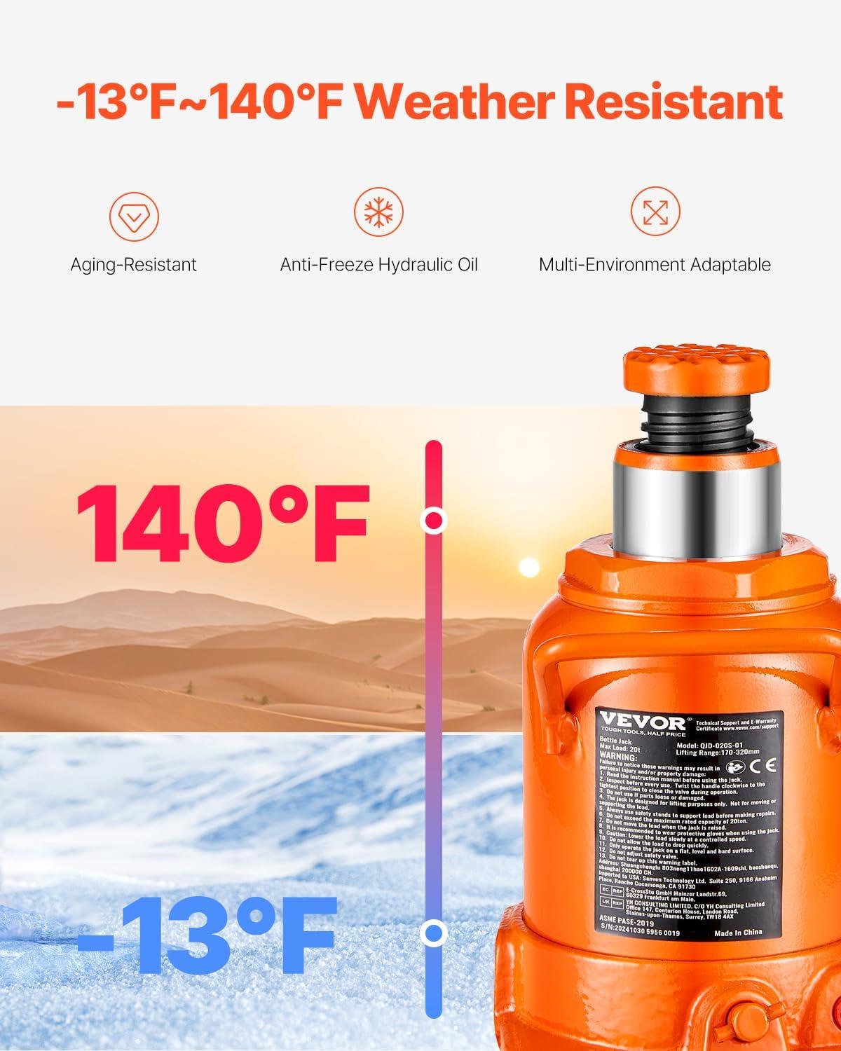 Leak-Proof Design: This hydraulic jack features precision industrial welding, with sealed connections to prevent leaks. It’s designed for all-weather use, with a temperature range of -13℉ to 140℉, ensuring reliable performance and reducing the risk of part aging and hydraulic oil freezing.