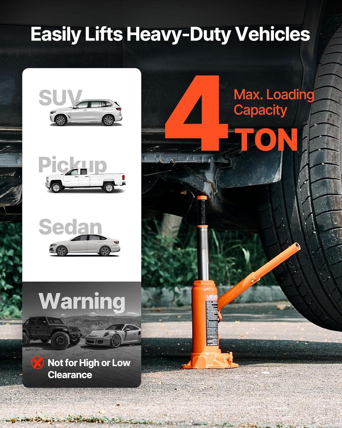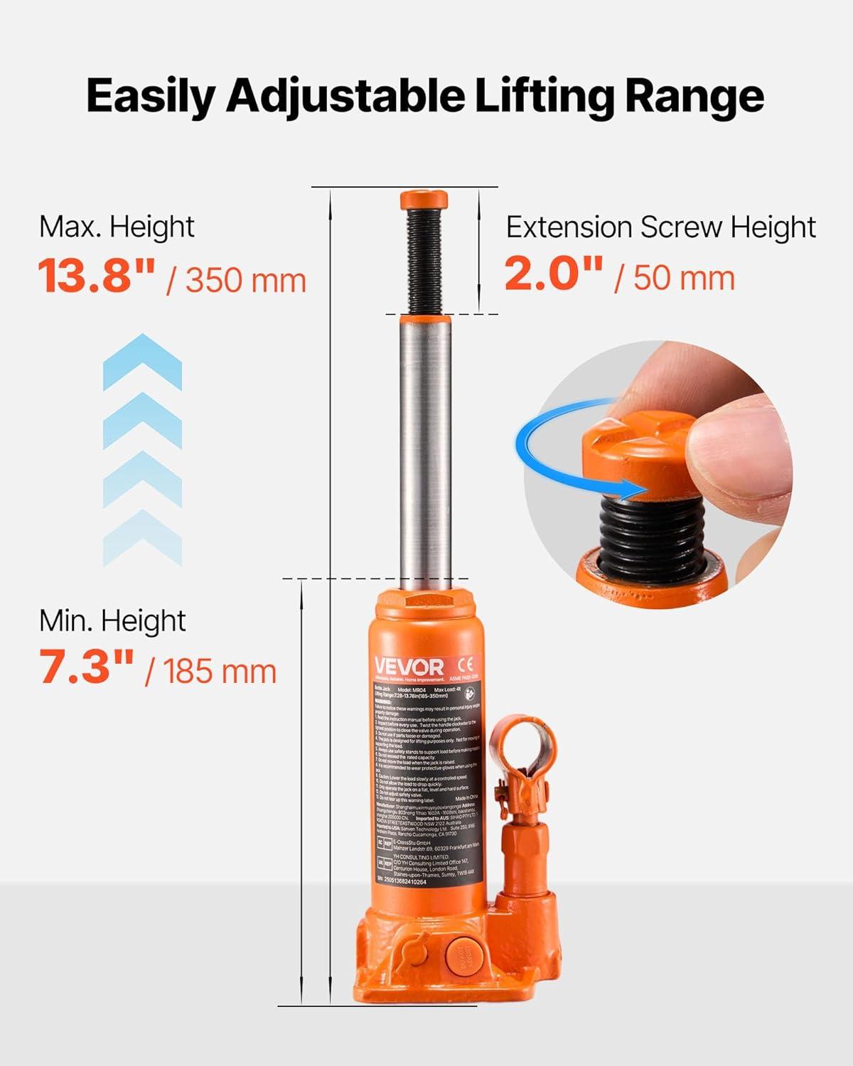 Adjustable Height: With a lifting range of 11-17.32 inches(280-440 mm), this hydraulic welded bottle jack offers flexibility for different vehicle chassis heights.