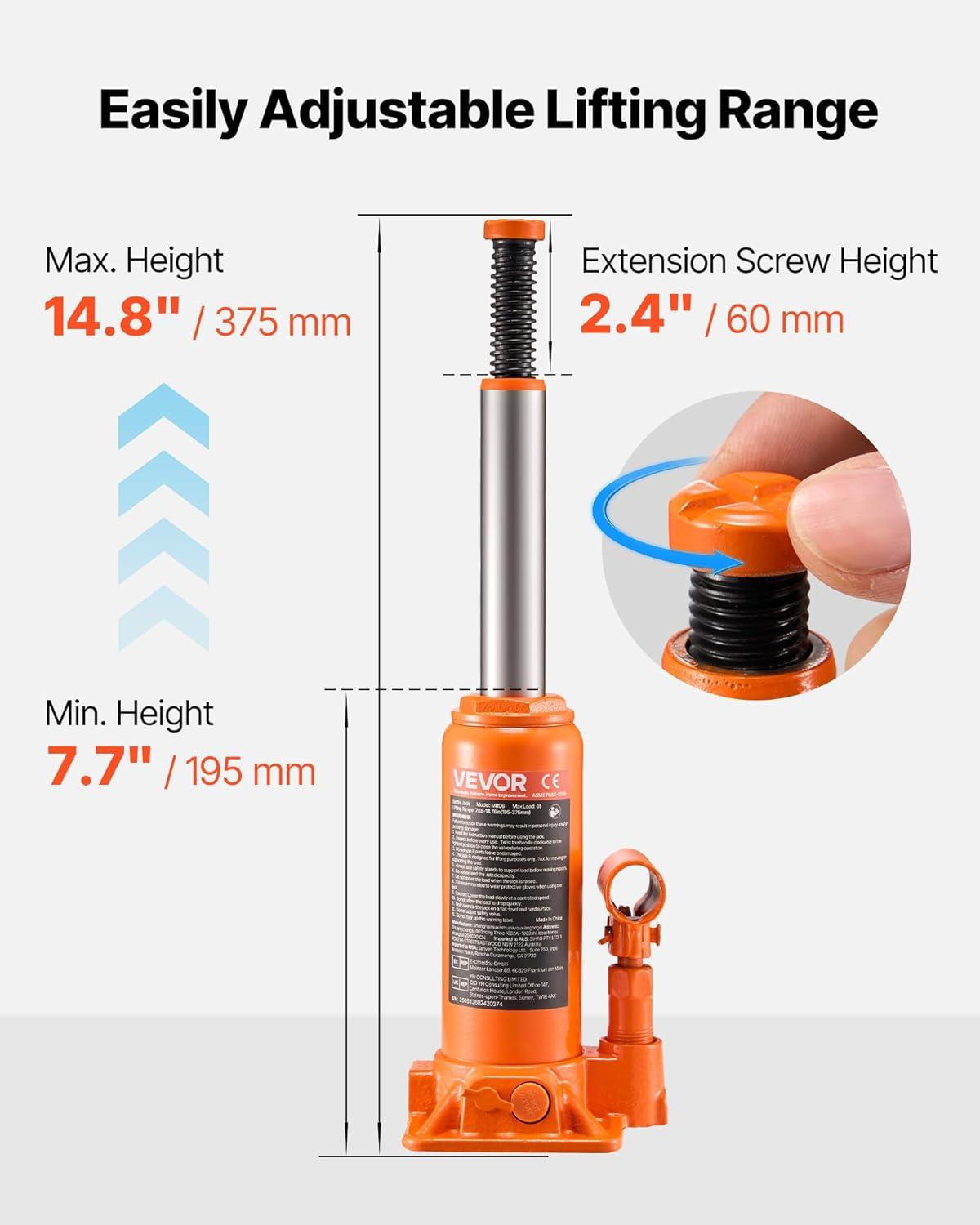 Adjustable Height: With a lifting range of 11-17.32 inches(280-440 mm), this hydraulic welded bottle jack offers flexibility for different vehicle chassis heights.