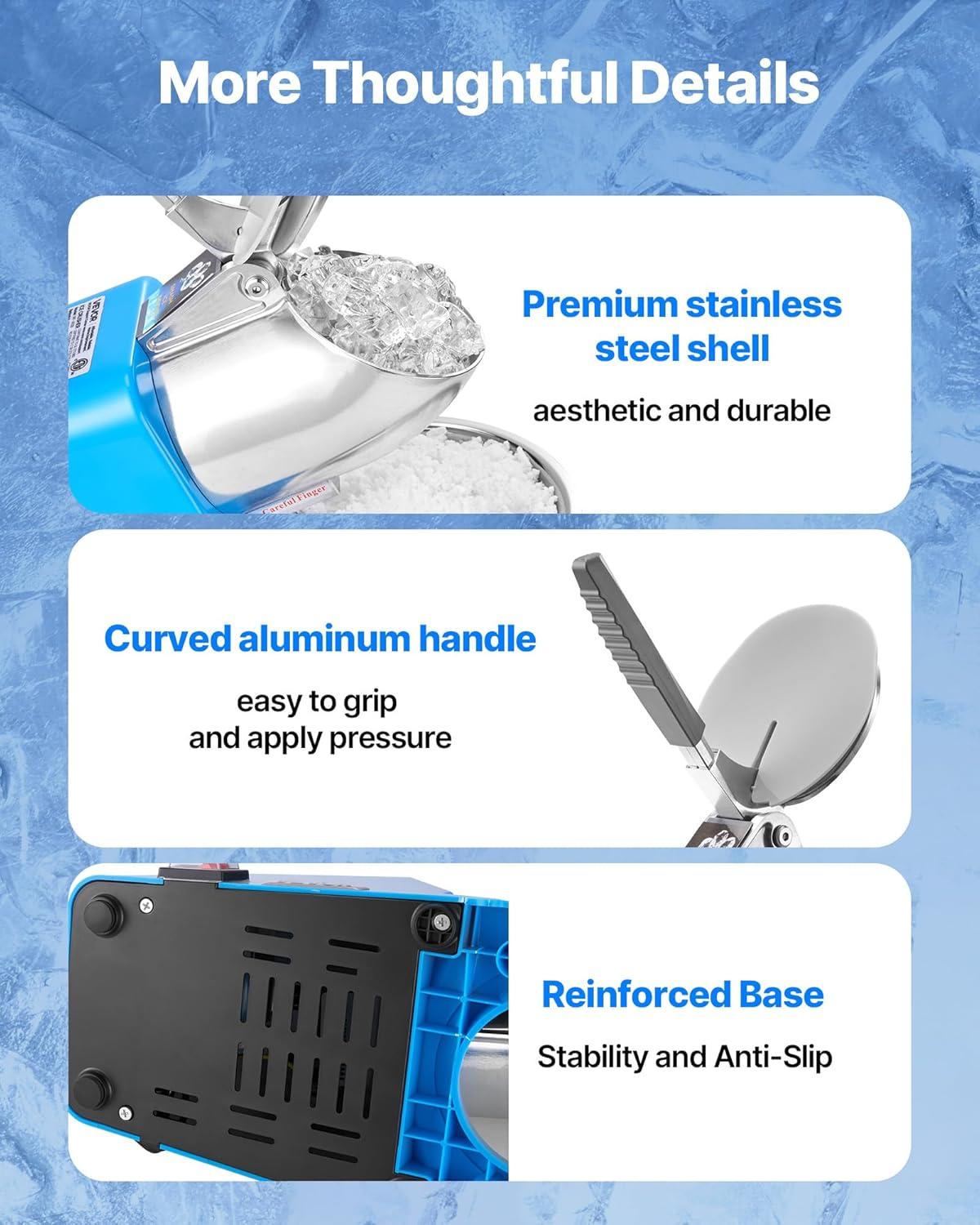High-Efficiency Ice Crushing: With a 300W motor and 2000 RPM, this ice crusher uses premium 4 stainless steel blades, achieving 286 lbs/h crushing capacity. It quickly turns ice cubes into fine snow, meeting all your ice-crushing needs