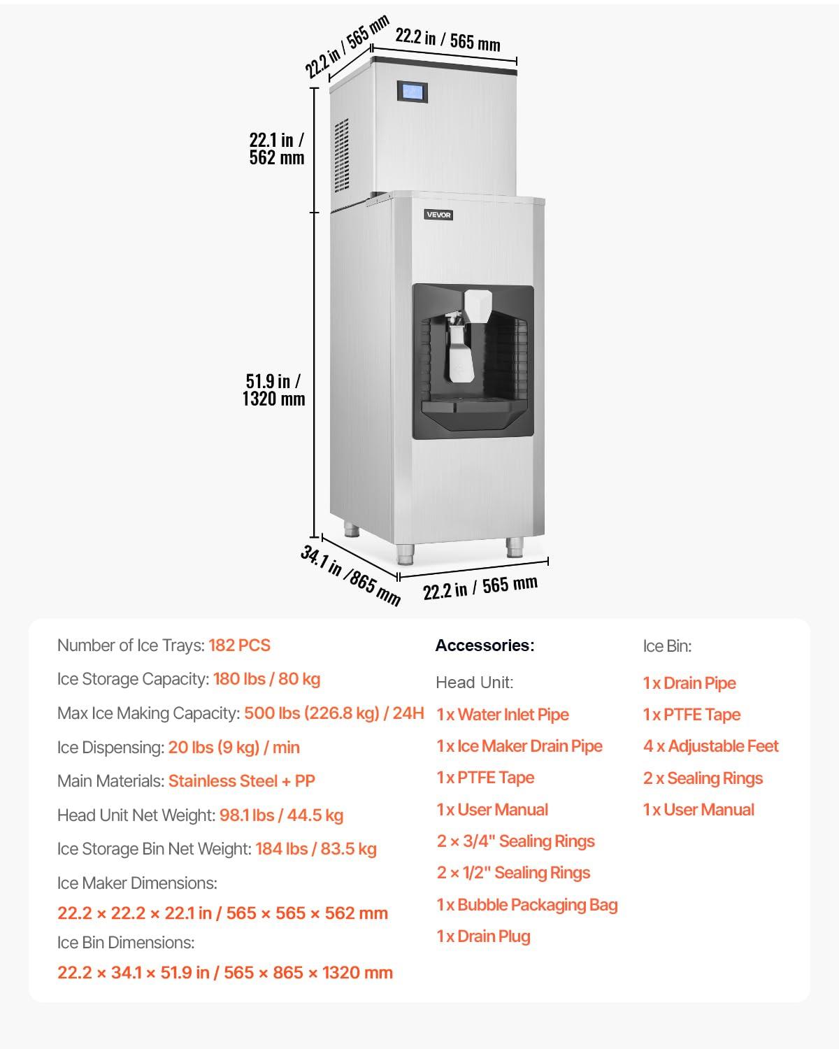VEVOR Ice Dispenser, Ice Storage Bin with 180 Lbs Storage Capacity, 20 Lbs/Min Automatic Ice Dispensing with Crusher, Height Adjustable Feet, for Commercial Ice Maker Machine, Restaurant and Hotel(500LBS/24H)