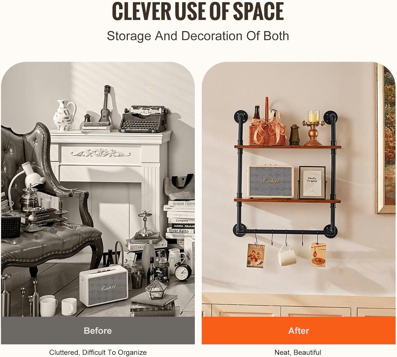 VEVOR Industrial Pipe Shelf, 2 Tier 24x7.87in, Wall-Mount Floating Rustic Wood Shelves Bracket Display Bookshelf, Storage Rack Sundries Holder for Kitchen Bedroom Bathroom Living Room, Black(2 Tier 24x7.87in)