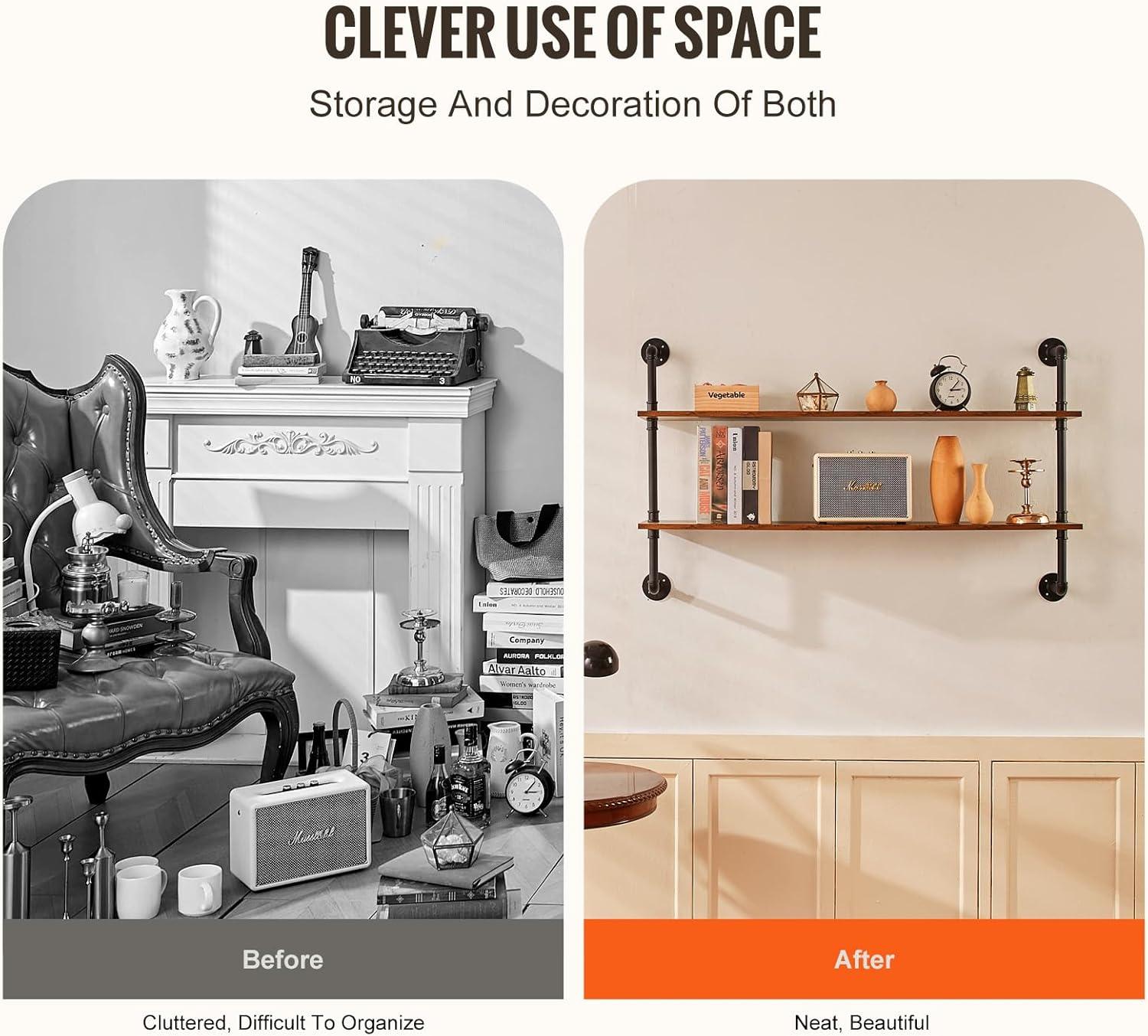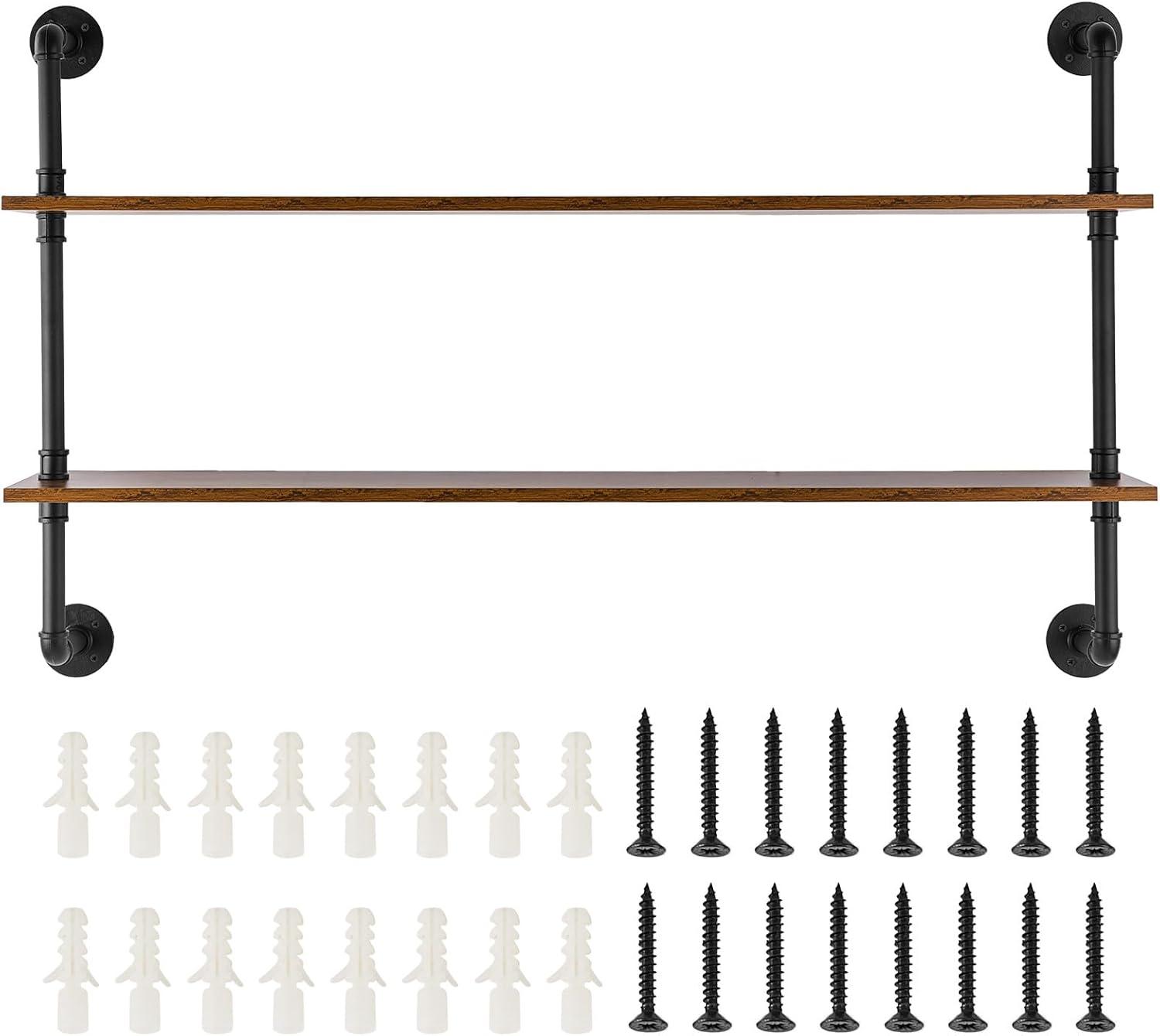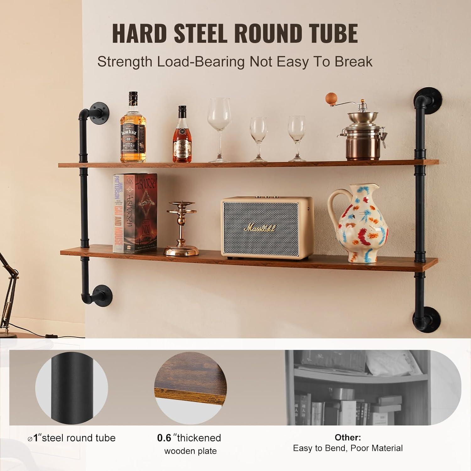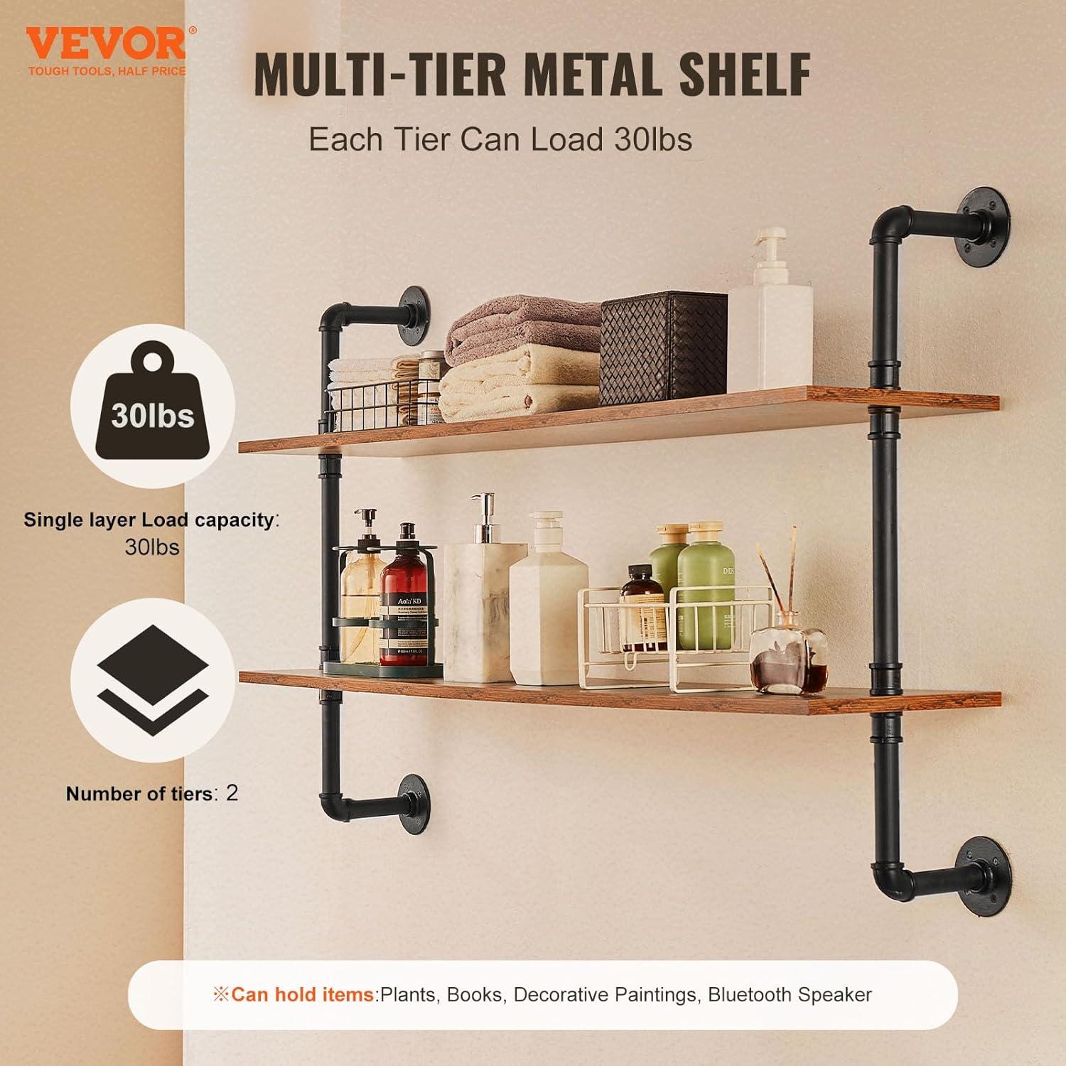 VEVOR Industrial Pipe Shelf, 2 Tier 24x7.87in, Wall-Mount Floating Rustic Wood Shelves Bracket Display Bookshelf, Storage Rack Sundries Holder for Kitchen Bedroom Bathroom Living Room, Black(2 Tier 48x 9.84in)