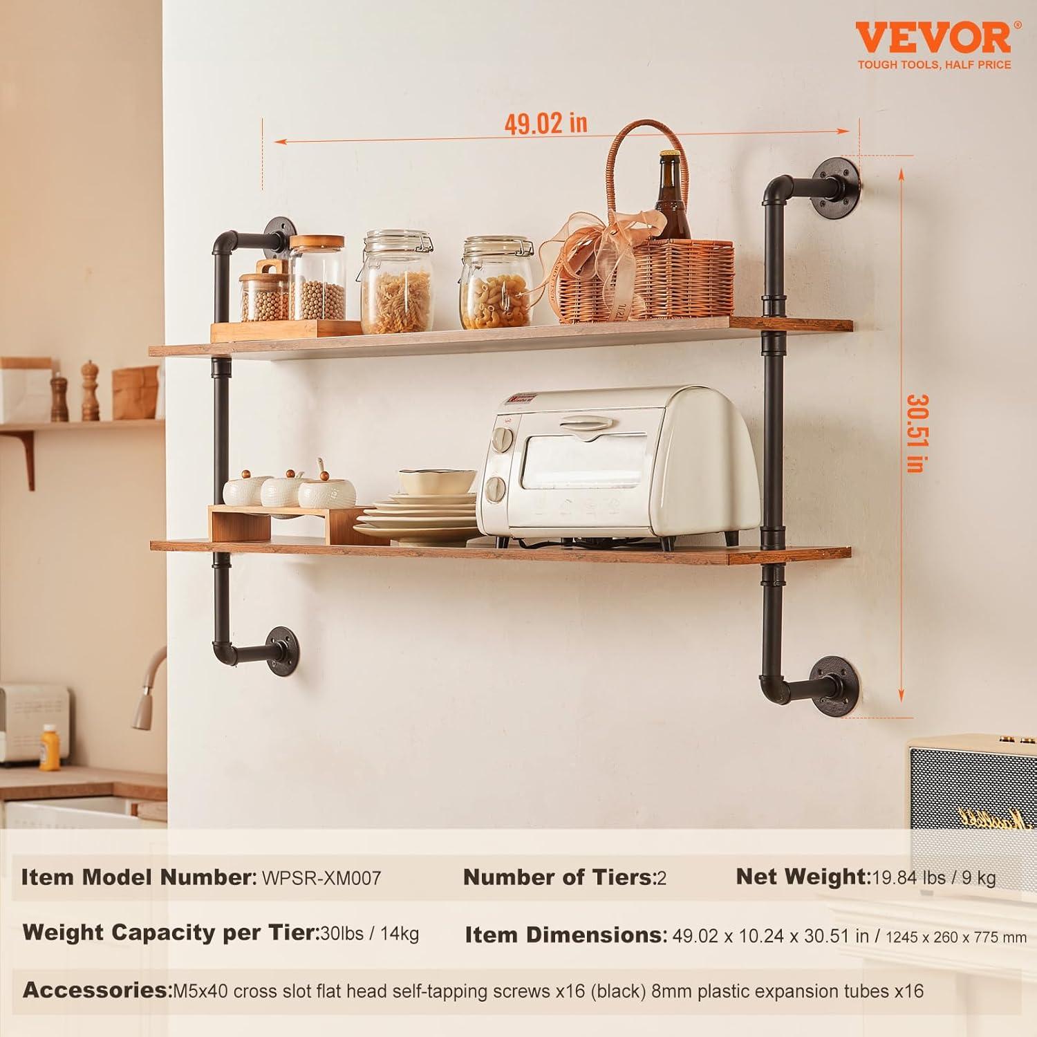 imageVEVOR Industrial Pipe Shelf 2 Tier 24x787in WallMount Floating Rustic Wood Shelves Bracket Display Bookshelf Storage Rack Sundries Holder for Kitchen Bedroom Bathroom Living Room Black2 Tier 48x 984in