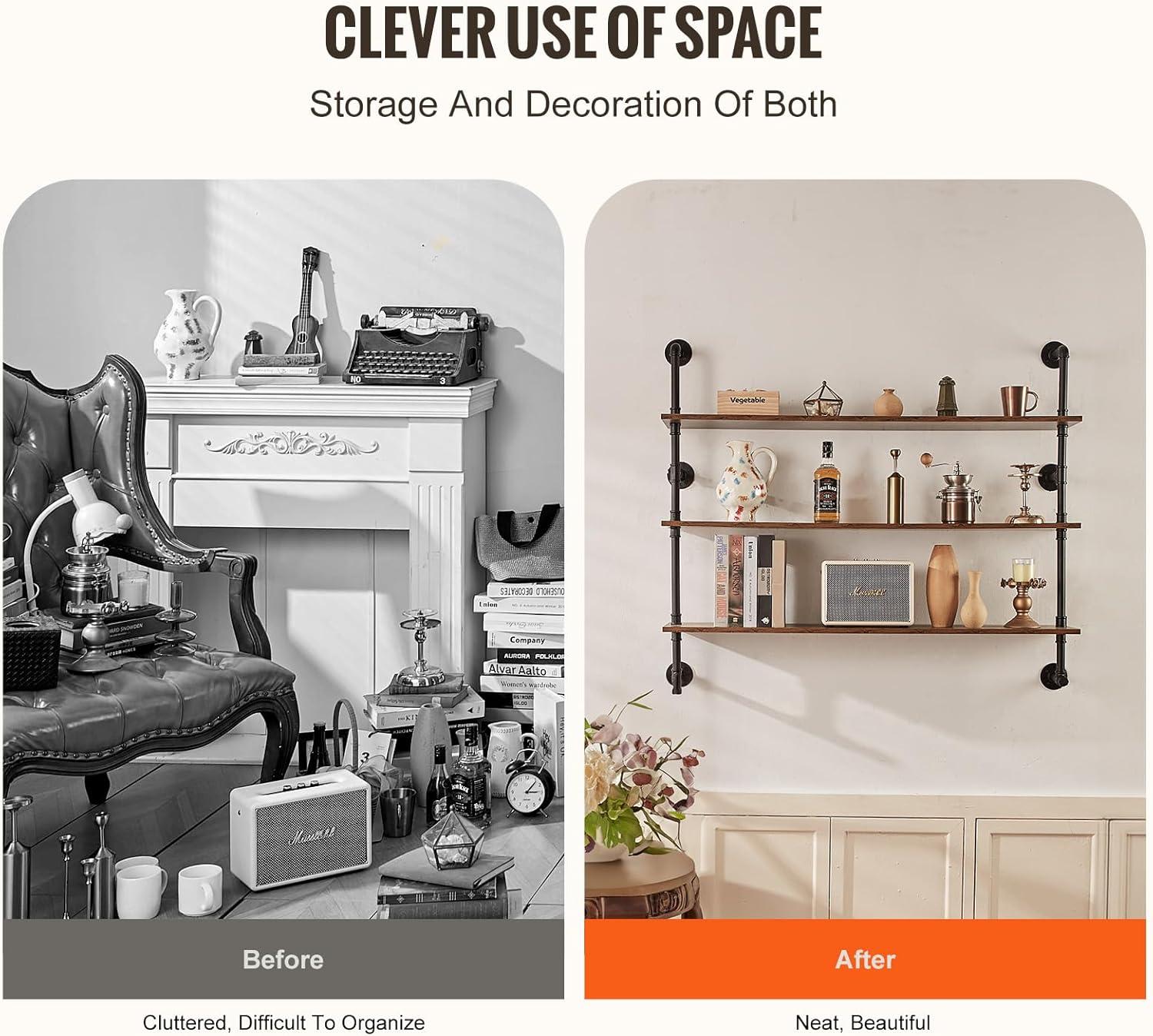 VEVOR Industrial Pipe Shelf, 2 Tier 24×7.87in, Wall-Mount Floating Rustic Wood Shelves Bracket Display Bookshelf, Storage Rack Sundries Holder for Kitchen Bedroom Bathroom Living Room, Black(3 Tier 41.5×9.84in)