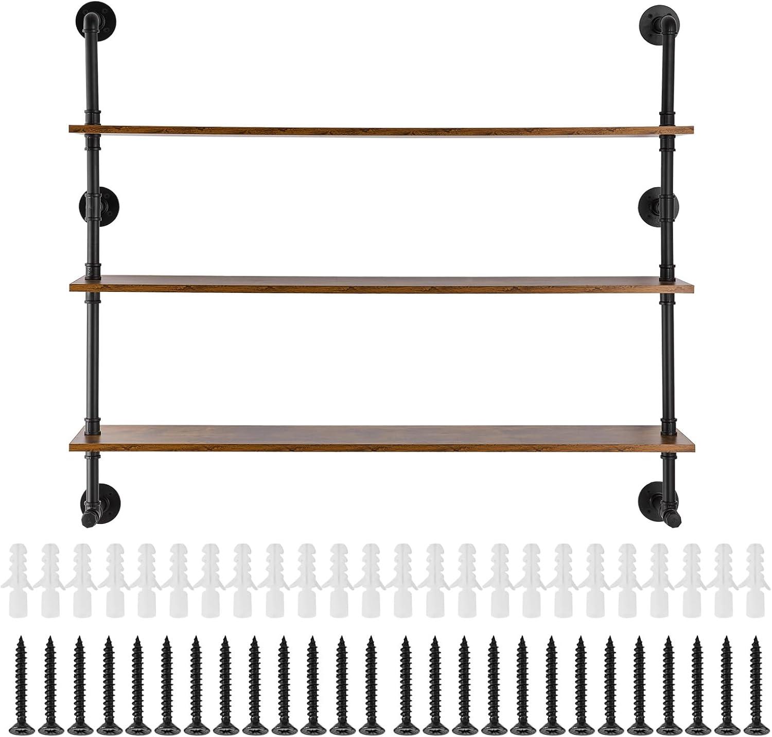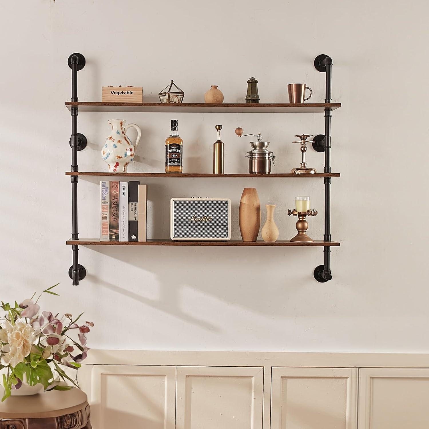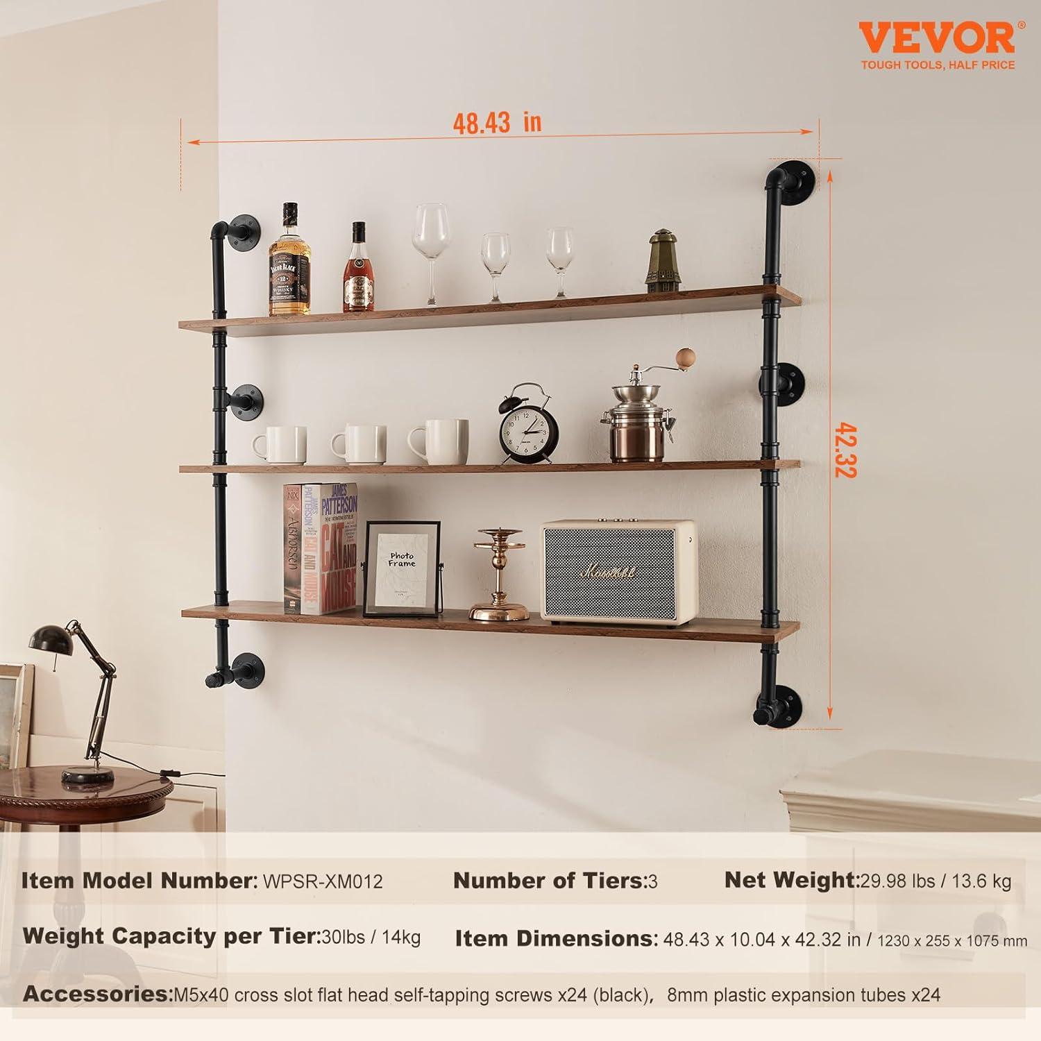 VEVOR Industrial Pipe Shelf, 2 Tier 24x7.87in, Wall-Mount Floating Rustic Wood Shelves Bracket Display Bookshelf, Storage Rack Sundries Holder for Kitchen Bedroom Bathroom Living Room, Black(3 Tier 48x9.84in)
