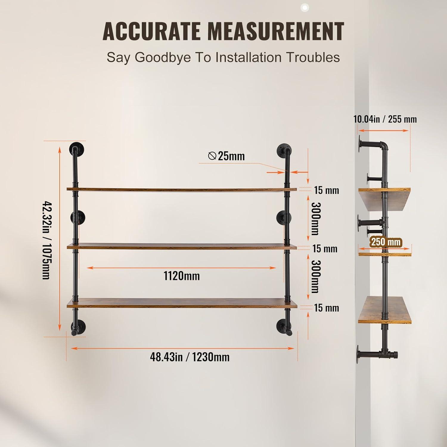 Precise Measurements: Our metal pipe shelving unit stands at 28.5″ tall with 12″ between each shelf. Be sure to measure your installation area beforehand for a perfect fit.