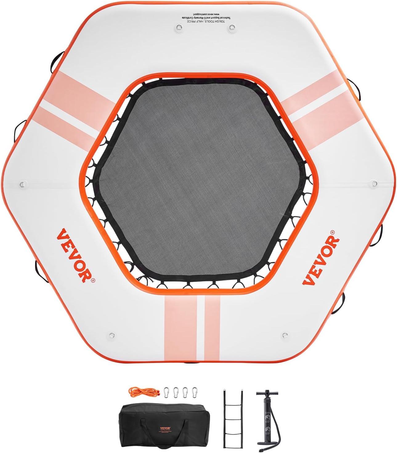 Advanced Central Pool Design: Our ø8.5 ft inflatable floating dock boasts a spacious ø5 ft hexagon trampoline mesh pool, reinforced with nylon borders and elastic cords for safe water fun. The included dual-action hand pump with pressure gauge ensures quick and effortless inflation and deflation, making setup a breeze for all.