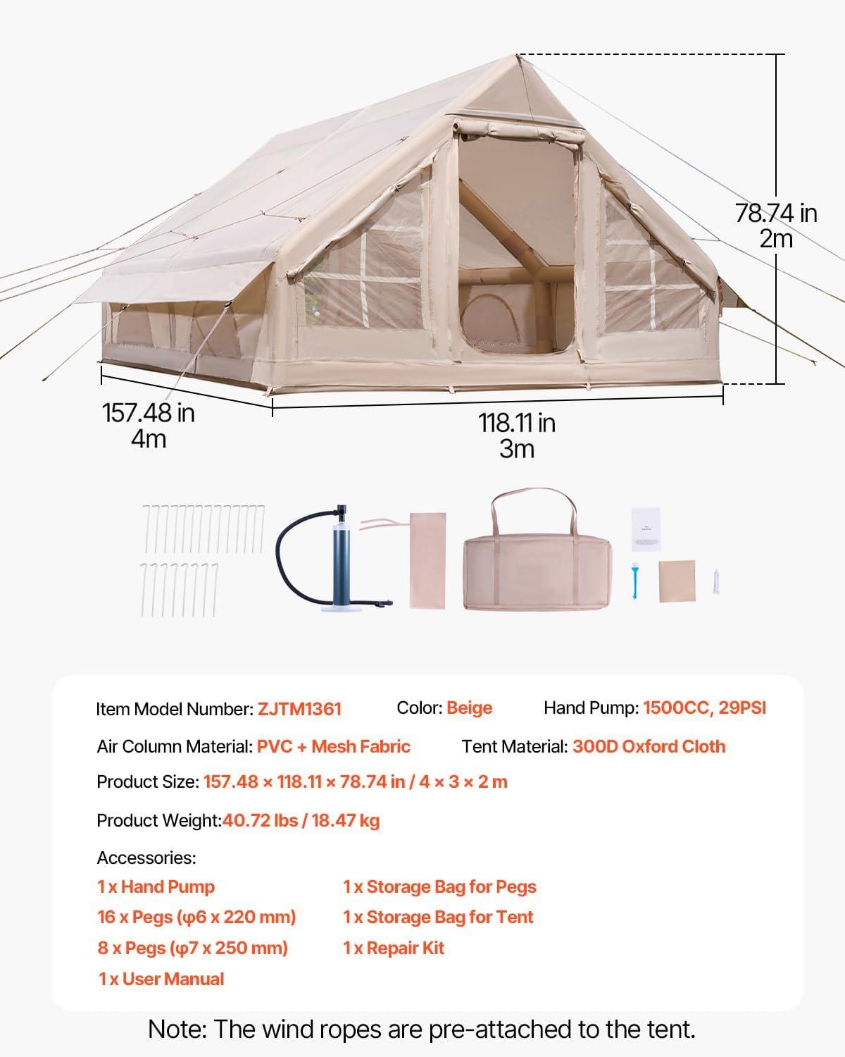 VEVOR Inflatable Tents for Camping, Easy Setup Blow up Tent with Hand Pump, 4 Season Glamping Tent with Stove Jack, Doors & Mesh Windows, Storage Bag Included for Easy Taking(4-6 Person)