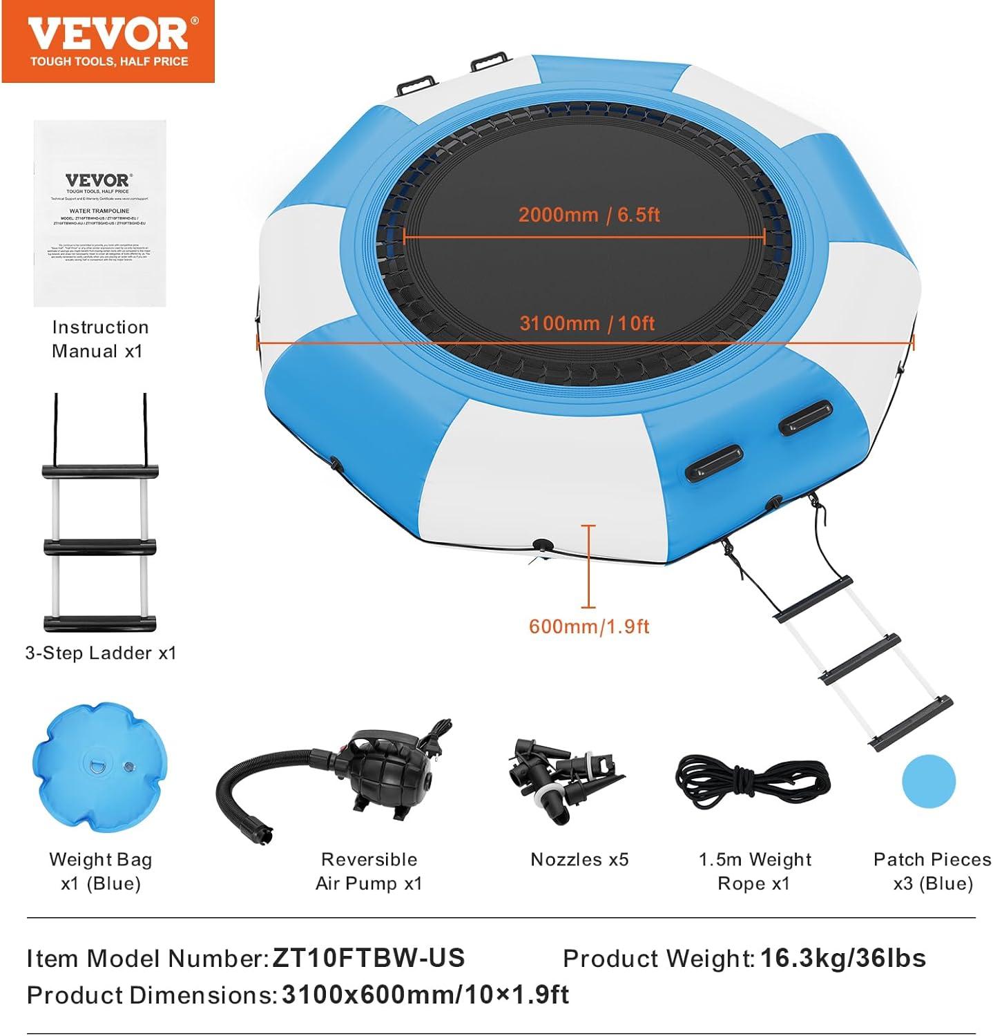 VEVOR Water Bouncer, 10ft Swim Trampoline, Easy-to-Carry Bouncing Platform with Slide, Includes 3-Step Ladder & Electric Pump, Ideal for Pool & Lake Activiti,Floating Jump System for Kids & Adults