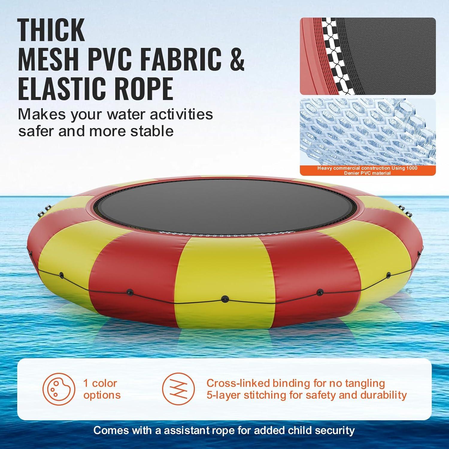 Durable Thick Materials: The recreational water bouncer uses 1000D thick PVC mesh fabric, with a smooth waterproof surface that is fire-resistant, cold-resistant, heat-resistant, and aging-resistant. It is designed in two vibrant colors. The bungee cords and five-layer stitching are tightly intertwined, providing greater stability and minimizing gaps. Multiple spare bungee cords can be flexibly adjusted. An auxiliary rope makes trampoline safer for children to use.