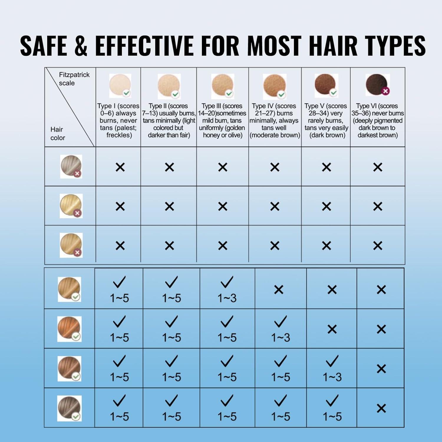 Visible Results Range from 3.8J-16.1J: Our IPL hair removal device delivers 3.8J-16.1J pulse energy with 510nm-1200nm broad light wavelength. With consistent use, visible hair reduction can be witnessed