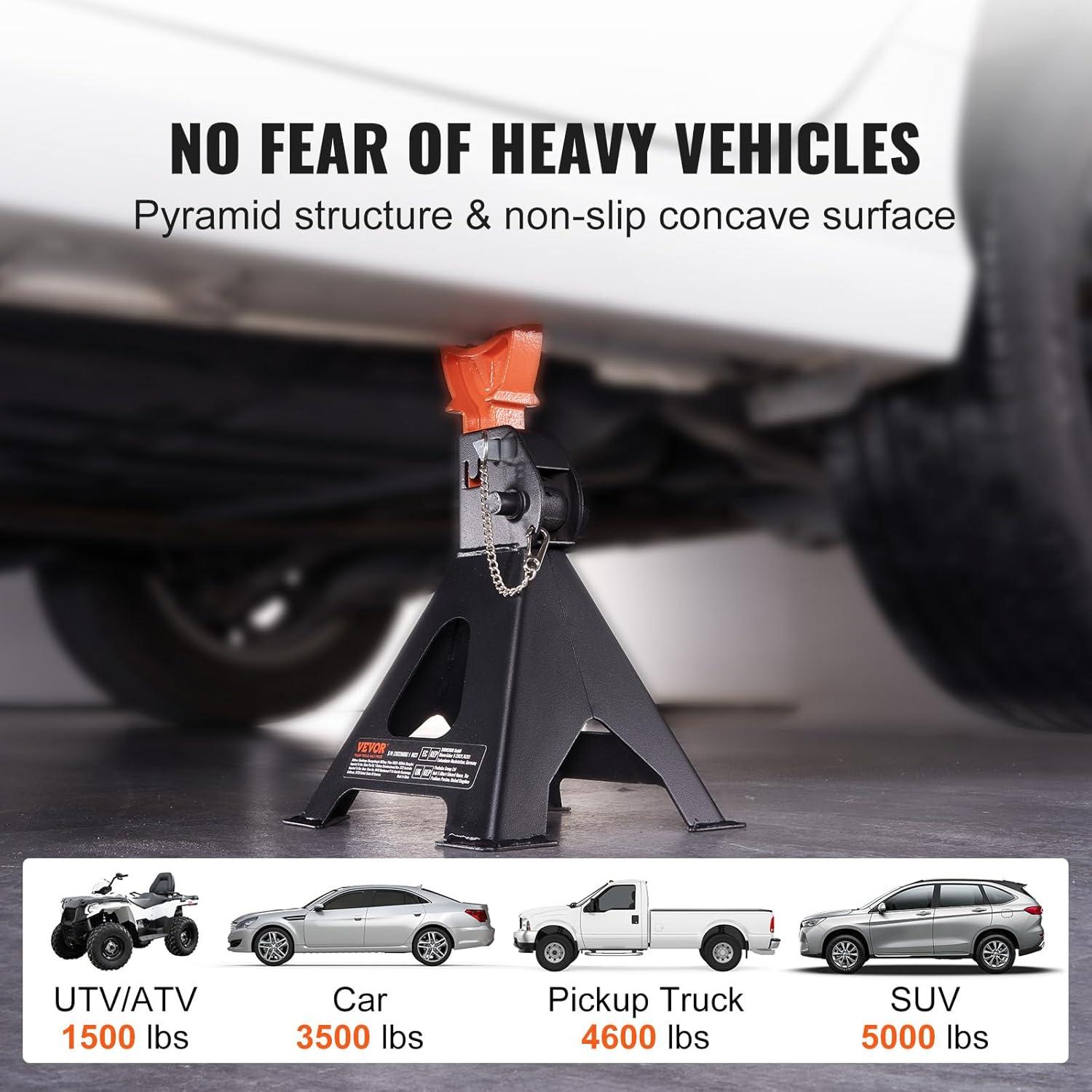 Handle A Big Load: Are you dealing with tough lifting jobs? VEVOR's jack stands have a 6 ton/13000 lbs loading capacity and can raise SUVs, pickups, cars, UTVs, and ATVs. They conform to CE standards, ensuring your safety during use. Feel confident during vehicle repairs!