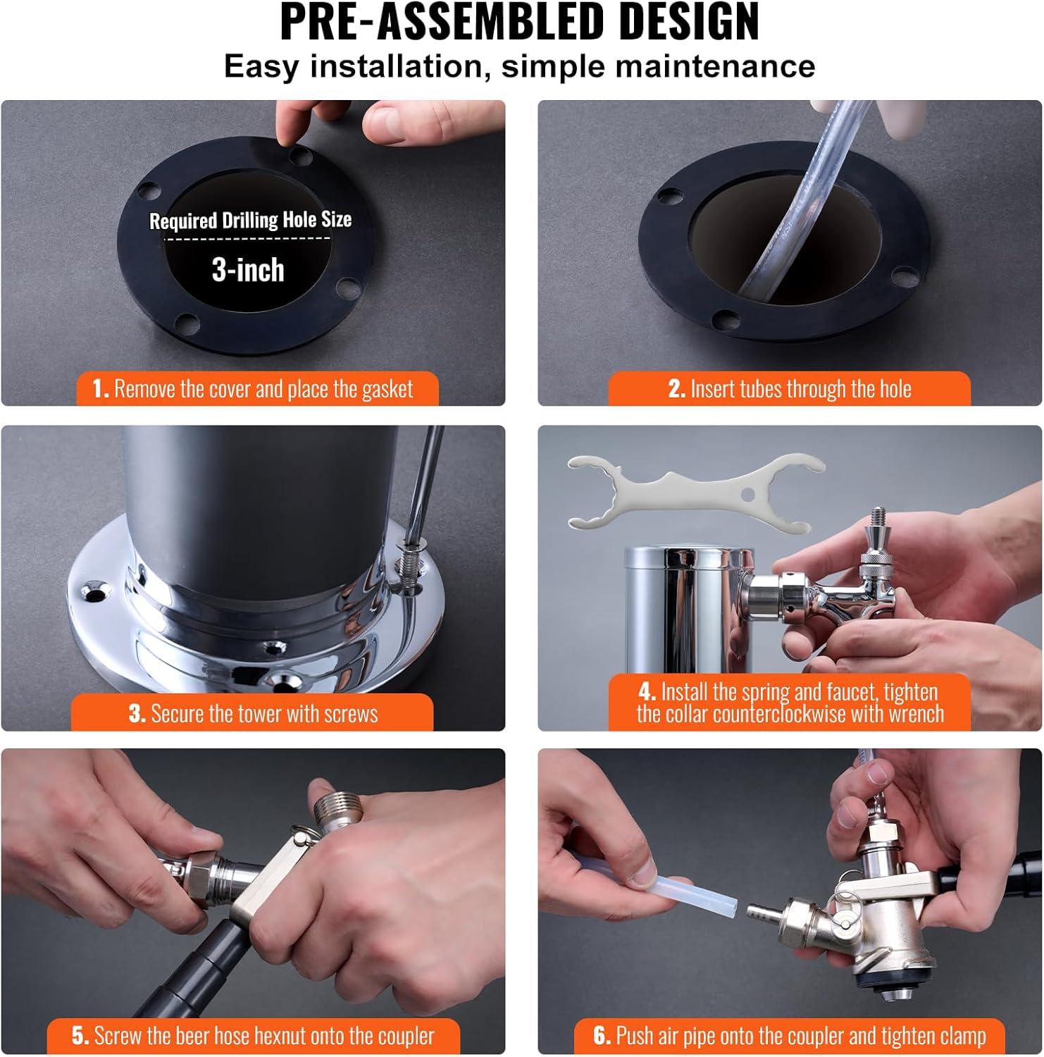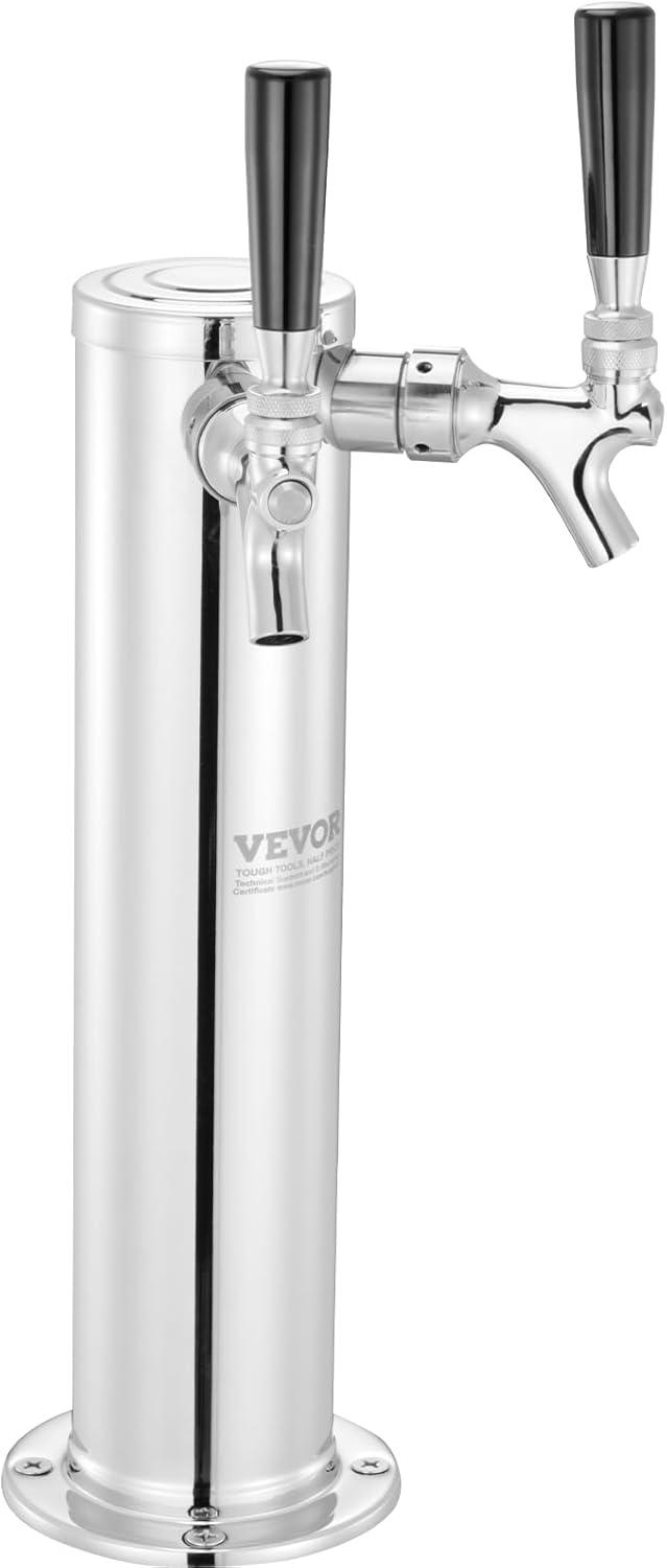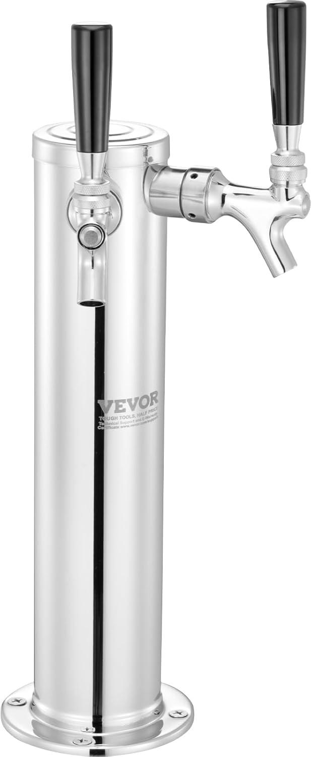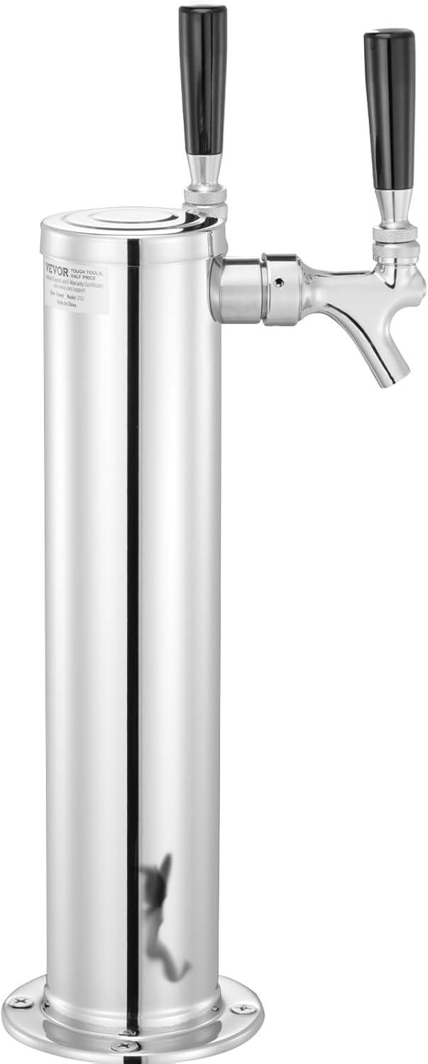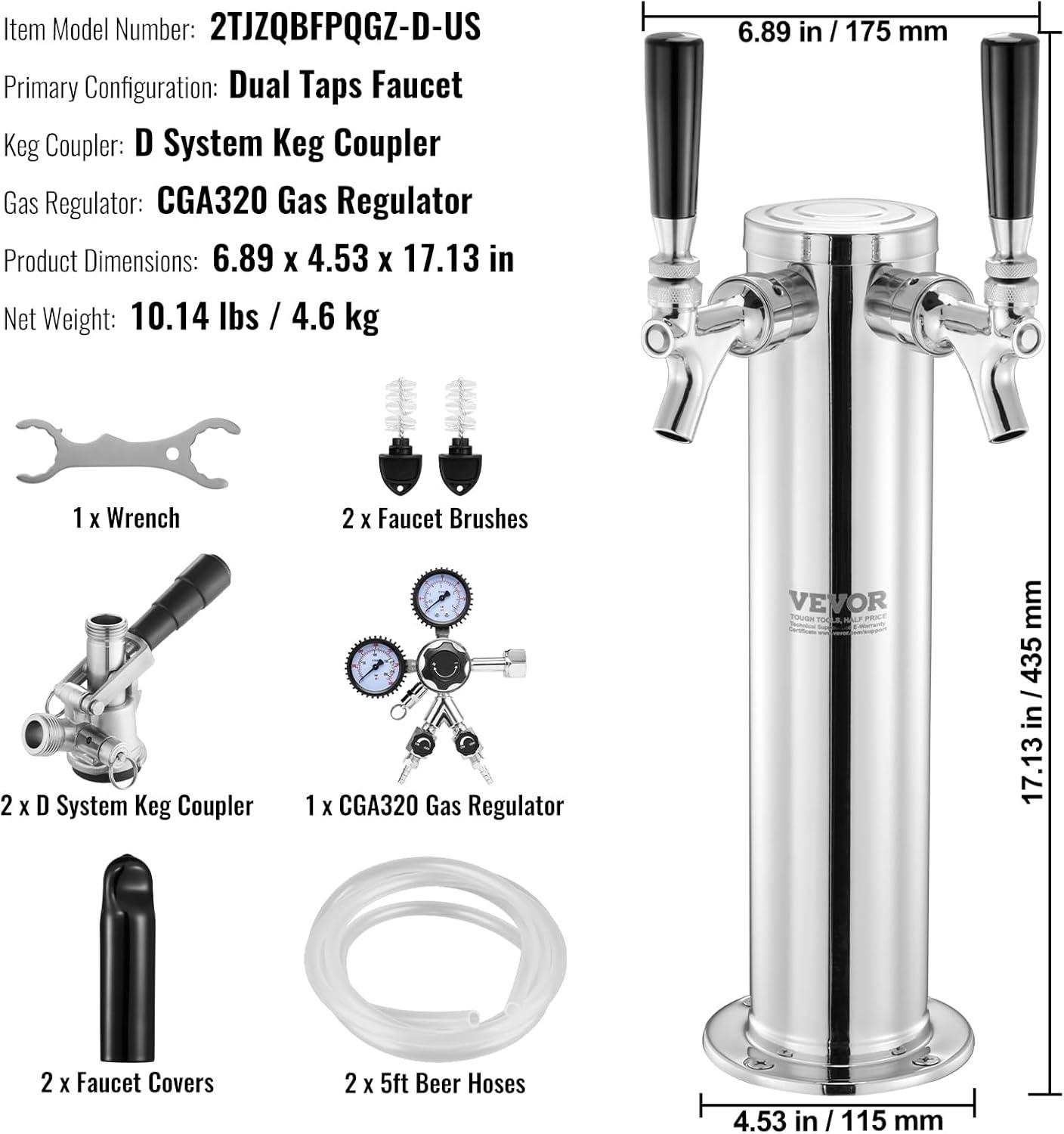 Single Faucet Beer Tower: Crafted from premium 304 stainless steel, the VEVOR single tap beer tower offers exceptional durability and reliability, ideal for both commercial and home kegerators. This kegerator tower kit includes a 5ft beer tubing, 1 D-system keg coupler, 1 dual-gauge CGA320 regulator, 1 tap wrench, 1 cleaning brush, 1 faucet cover, and a set of assembly accessories.