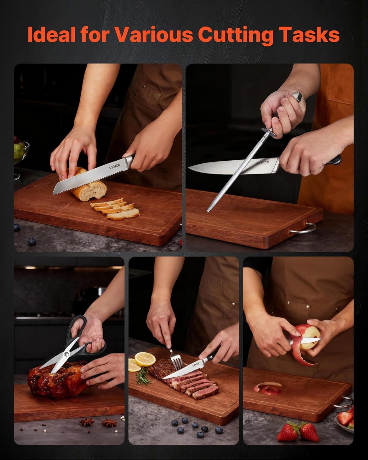 VEVOR Kitchen Knife Set with Block and Sharpener, 15 Piece German High Carbon Stainless Steel Knife Set, Kitchen Cutlery with PP Ergonomic Handle, Sharpening Rod and Wooden Block, for Home Cooks(Blade: Stainless Steel Silver; Handle: Black; Knife Block: Natural Wood Color)
