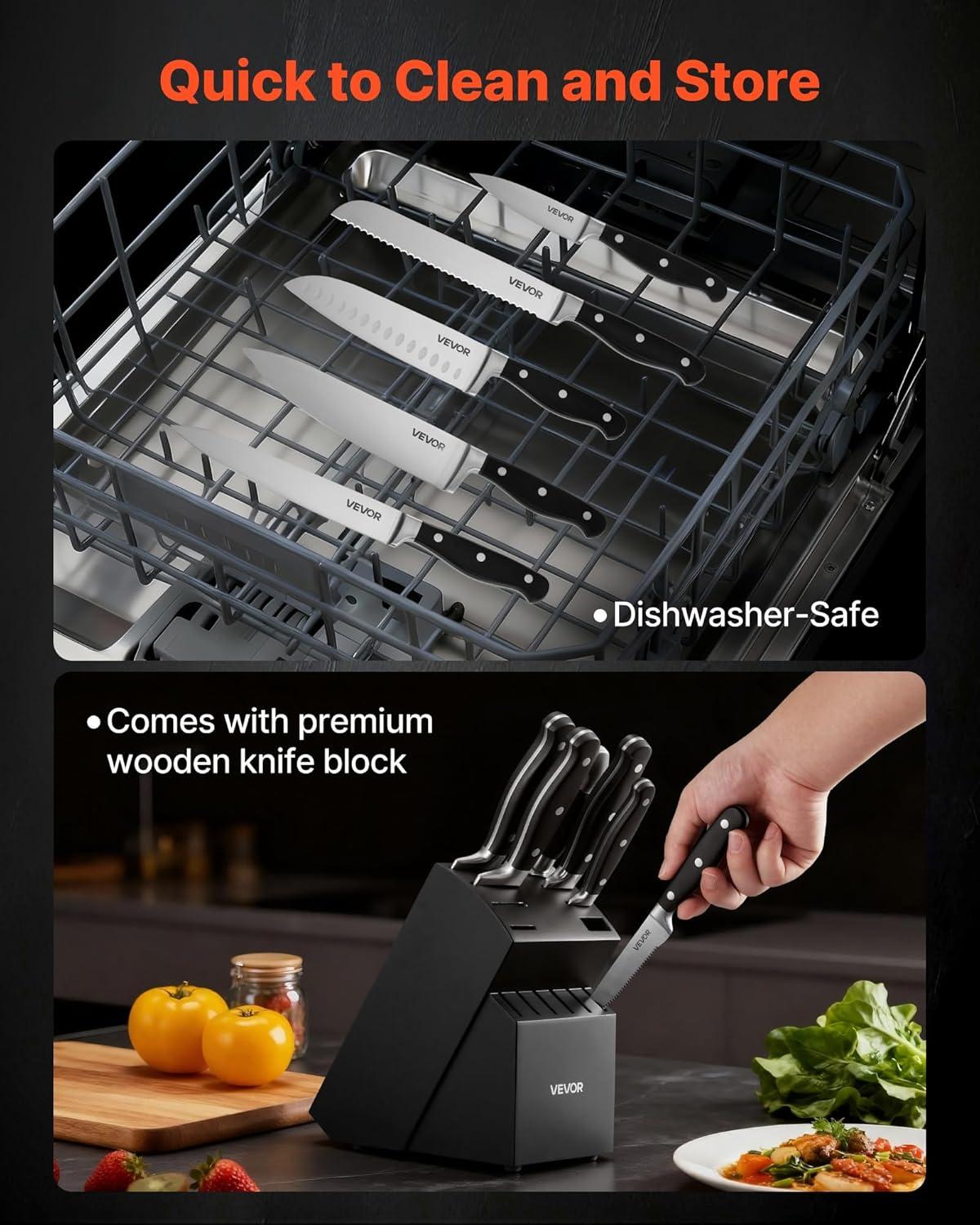 Easy Storage & Maintenance: The knife block’s divided slots make access and organization easy, avoiding accidental cuts. All blades are dishwasher-safe for quick cleanup. This kitchen knife block set also includes an 8 in sharpening rod to keep your knives sharp and ready at all times