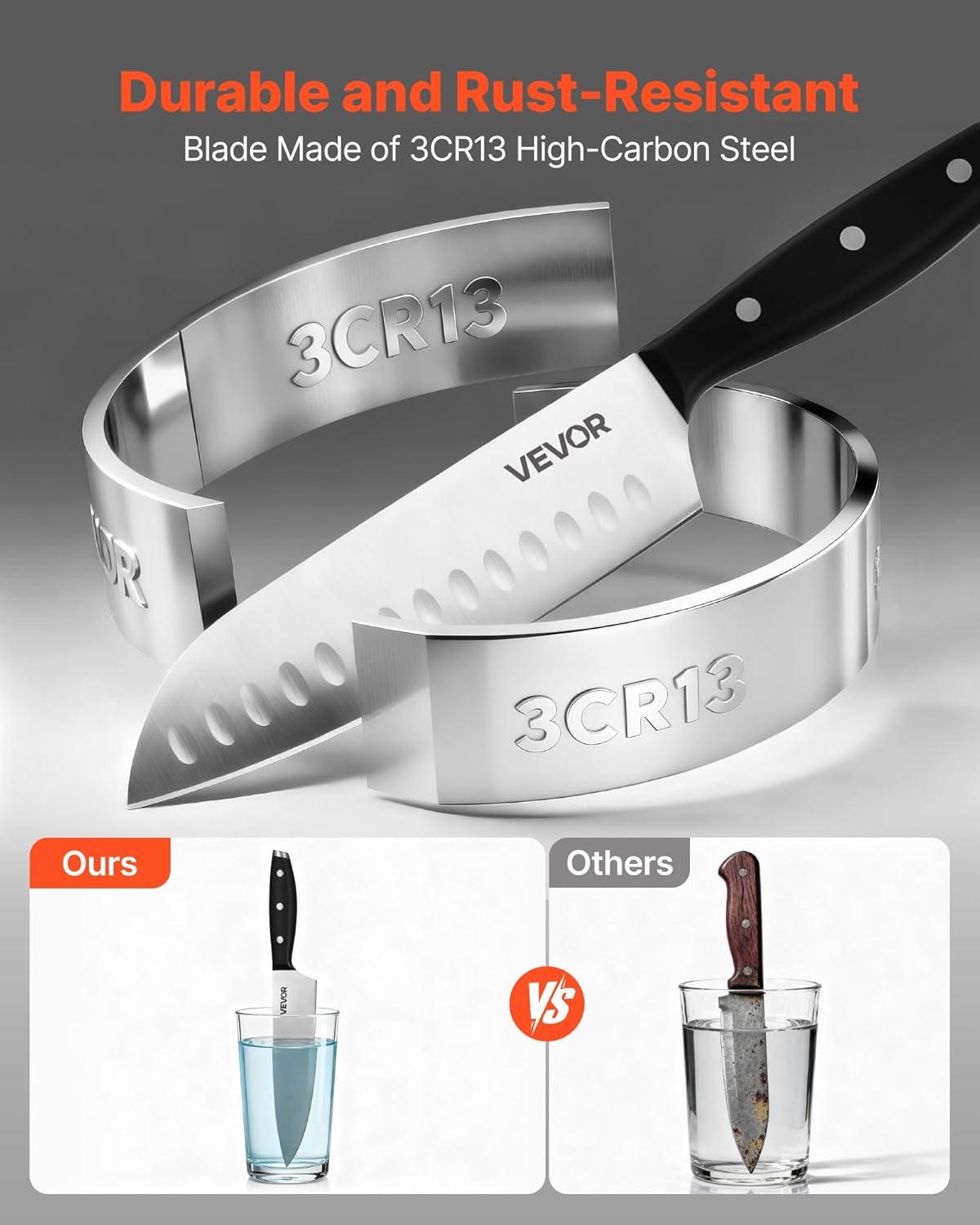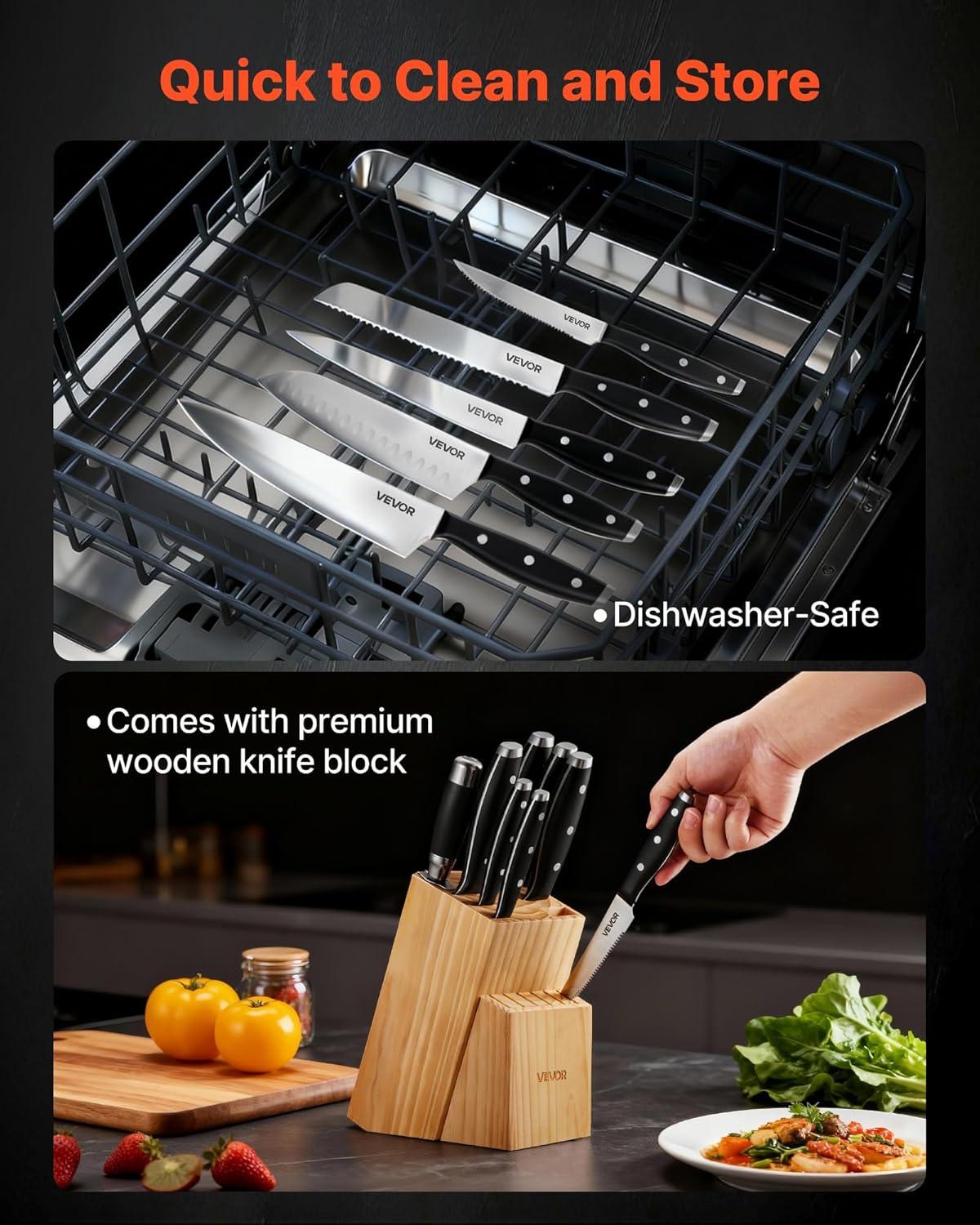 Easy Storage & Maintenance: The knife block’s divided slots make access and organization easy, avoiding accidental cuts. All blades are dishwasher-safe for quick cleanup. This kitchen knife block set also includes an 8 in sharpening rod to keep your knives sharp and ready at all times