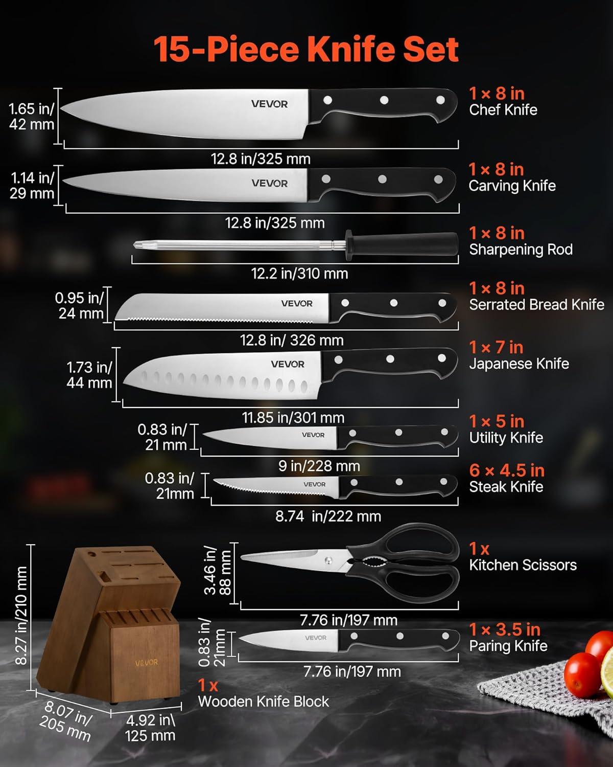 15-Piece Kitchen Knife Set: This 15-piece kitchen knife set includes an 8 in chef’s knife, 8 in slicing knife, 8 in bread knife, 7 in santoku knife, 5 in utility knife, six 4.5 in steak knives, 3.5 in paring knife, 8 in sharpening rod, kitchen scissors, and a wooden block. One set meets daily cutting needs like slicing, chopping, and peeling. Its modern design makes it an ideal gift for holidays and special occasions