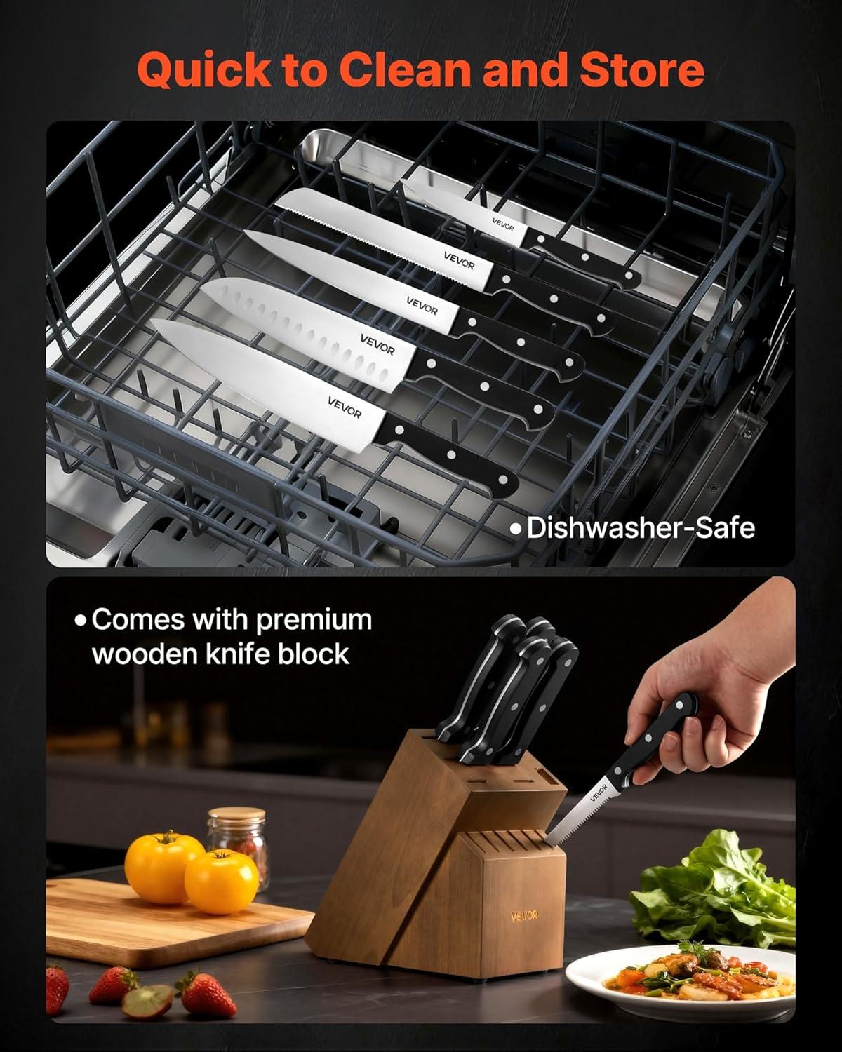 Easy Storage & Maintenance: The knife block’s divided slots make access and organization easy, avoiding accidental cuts. All blades are dishwasher-safe for quick cleanup. This kitchen knife block set also includes an 8 in sharpening rod to keep your knives sharp and ready at all times