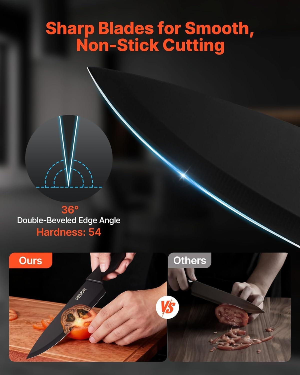 VEVOR Kitchen Knife Set with Block and Sharpener, 15 Piece German High Carbon Stainless Steel Knife Set, Kitchen Cutlery with PP Ergonomic Handle, Sharpening Rod and Wooden Block, for Home Cooks(Blade: Black; Handle: Black; Knife Block: Black)