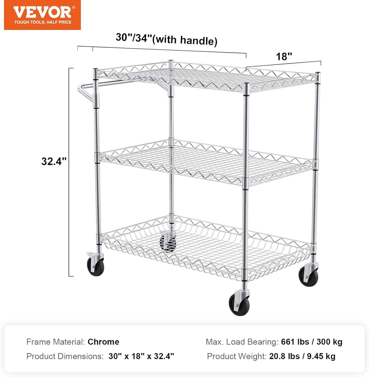 VEVOR Kitchen Utility Cart, 3 Tiers, Wire Rolling Table with 661 LBS Capacity, Steel Service Desk on Wheels, Metal Storage Trolley with 80 mm Deep Basket Curved Handle PP Liner 6 Hooks(18"D x 30"W x 32.4"H)