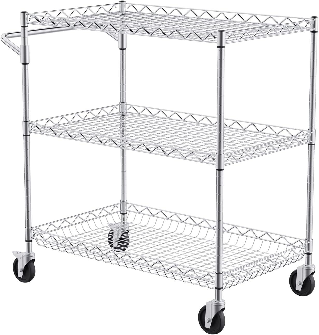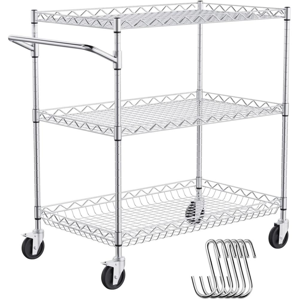 VEVOR Kitchen Utility Cart, 3 Tiers, Wire Rolling Table with 661 LBS Capacity, Steel Service Desk on Wheels, Metal Storage Trolley with 80 mm Deep Basket Curved Handle PP Liner 6 Hooks(18″D x 35″W x 40.9″H)