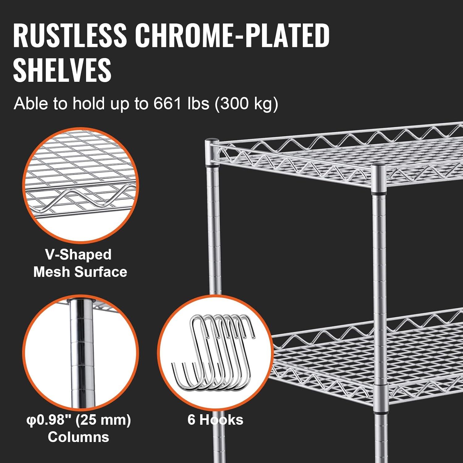 imageVEVOR Kitchen Utility Cart 3 Tiers Wire Rolling Table with 661 LBS Capacity Steel Service Desk on Wheels Metal Storage Trolley with 80 mm Deep Basket Curved Handle PP Liner 6 Hooks18D x 30W x 324H