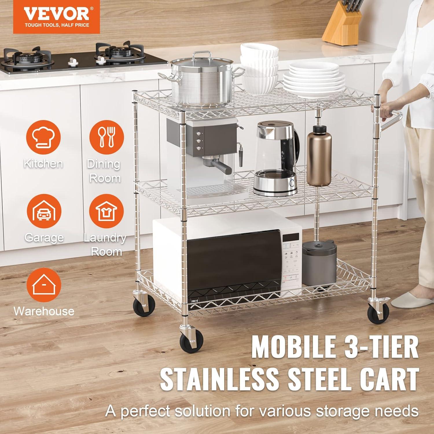 Load Up and Roll: Are you ready to get more out of your kitchen space? VEVOR's 3-tier utility cart is made of industrial-strength steel, ensuring durability and resistance to deformation. It can carry up to 661 lbs / 300 kg of heavy objects, perfect for storing and transporting large kitchen appliances, heavy machinery, etc. Time to load up and roll!