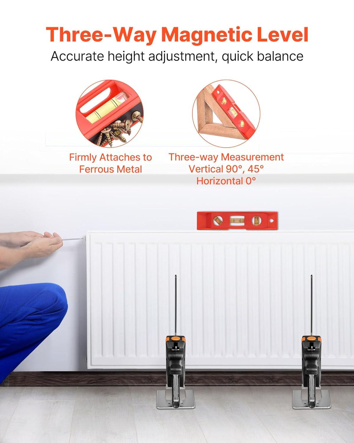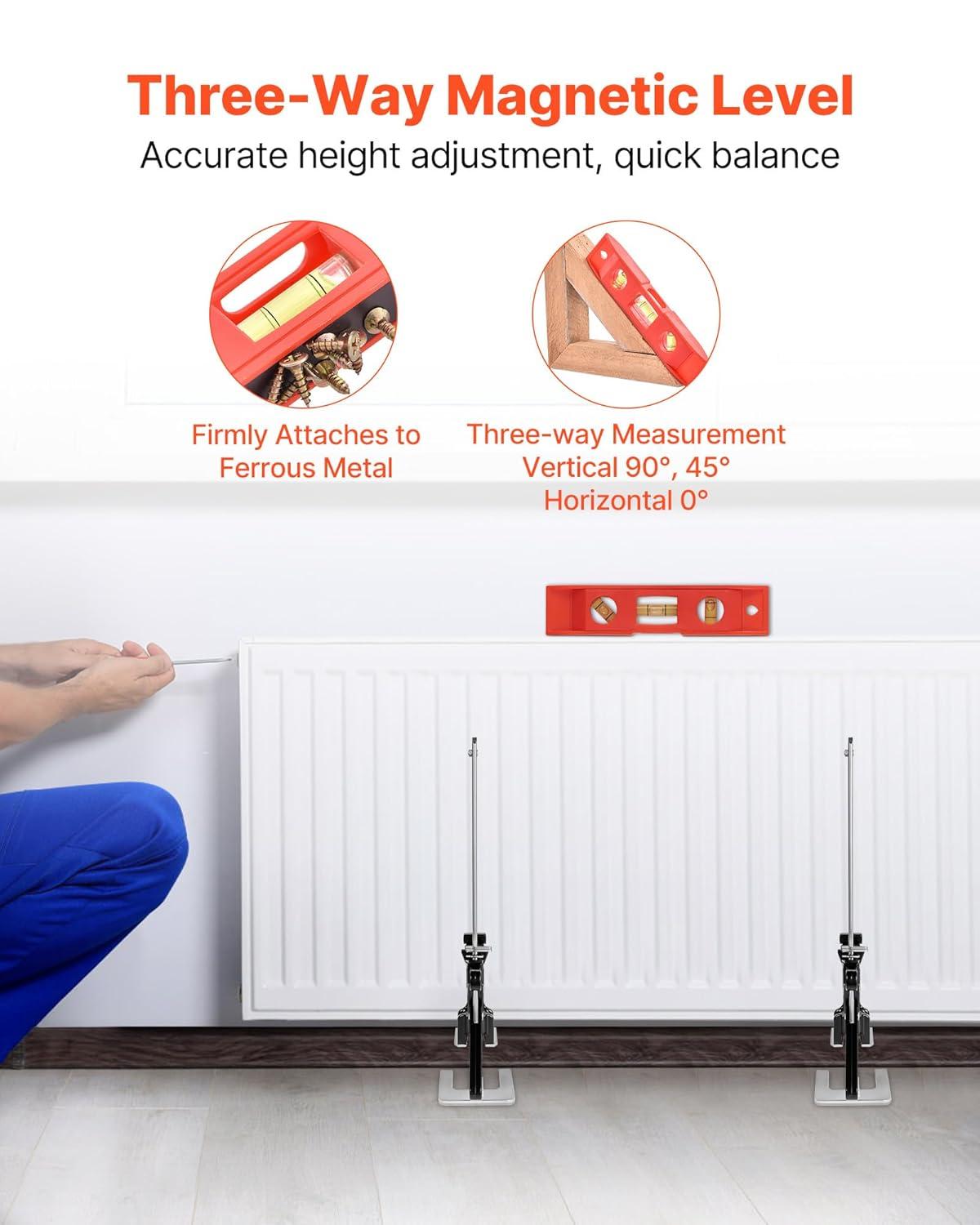Precision Positioning: This labor saving arm features a three-way magnetic level for 0°, 45°, and 90° measurements, ensuring precise height adjustments. It securely attaches to iron surfaces for stable support, enhancing work efficiency and balancing