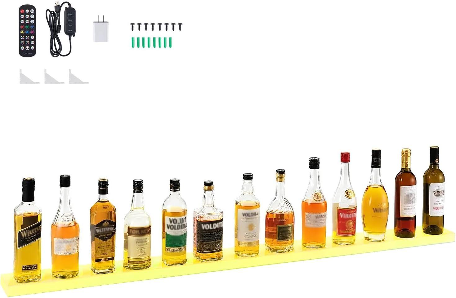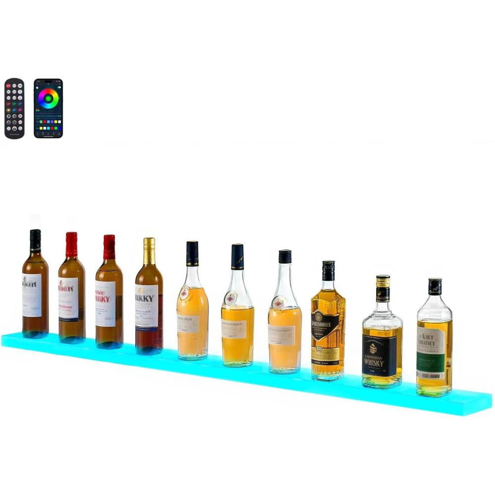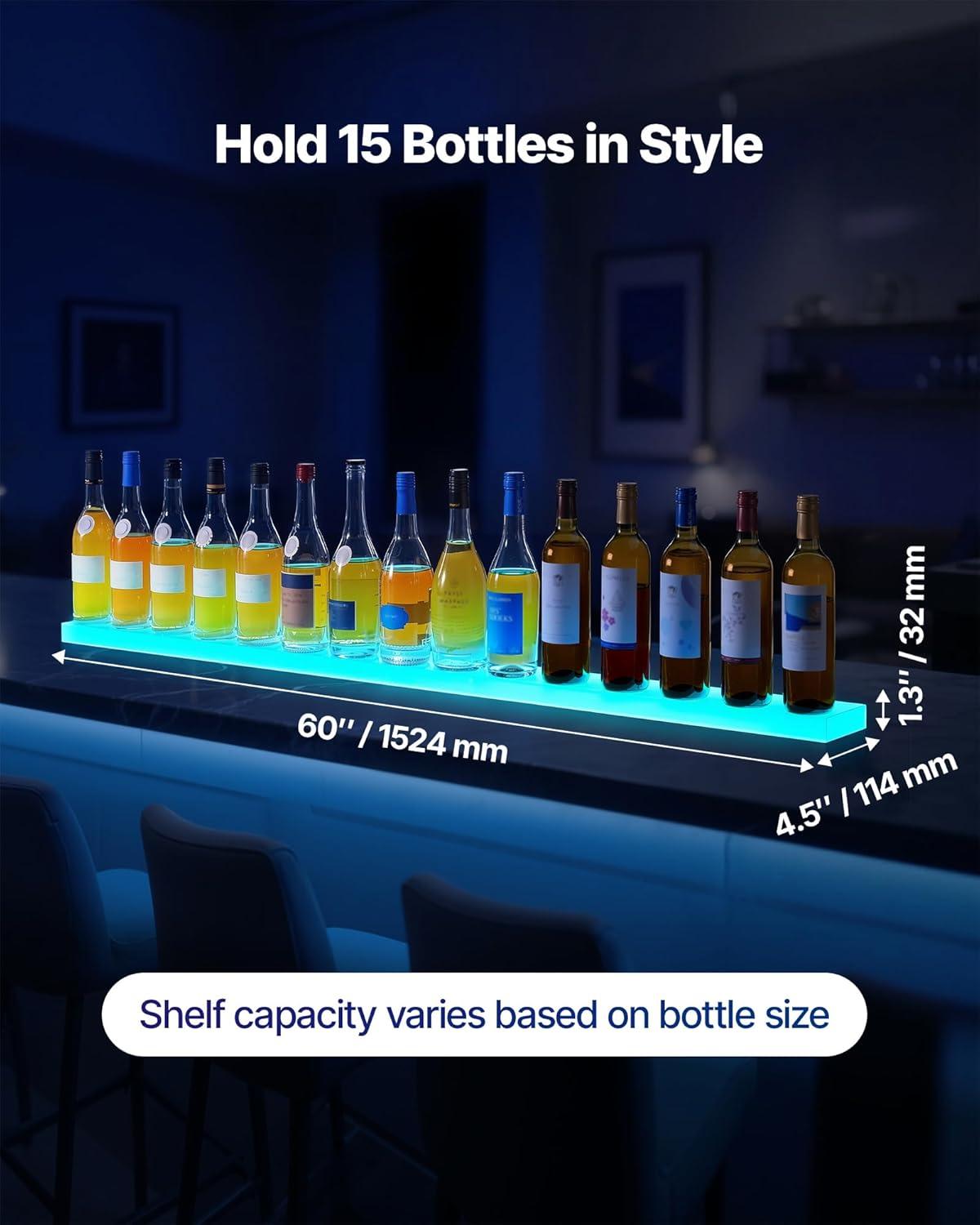 VEVOR LED Lighted Liquor Bottle Display, 1 Tier 60 Inches Whiskey Rack, Supports USB, Illuminated Home Bar Shelf with RF Remote & App Control, 7 Static Colors, Acrylic Lighted Shelf for 15 Bottles(1 Step 60 Inches)