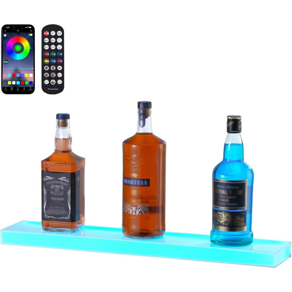 VEVOR LED Lighted Liquor Bottle Display, 1 Tier 60 Inches Whiskey Rack, Supports USB, Illuminated Home Bar Shelf with RF Remote & App Control, 7 Static Colors, Acrylic Lighted Shelf for 15 Bottles(1 Step 24 Inches)